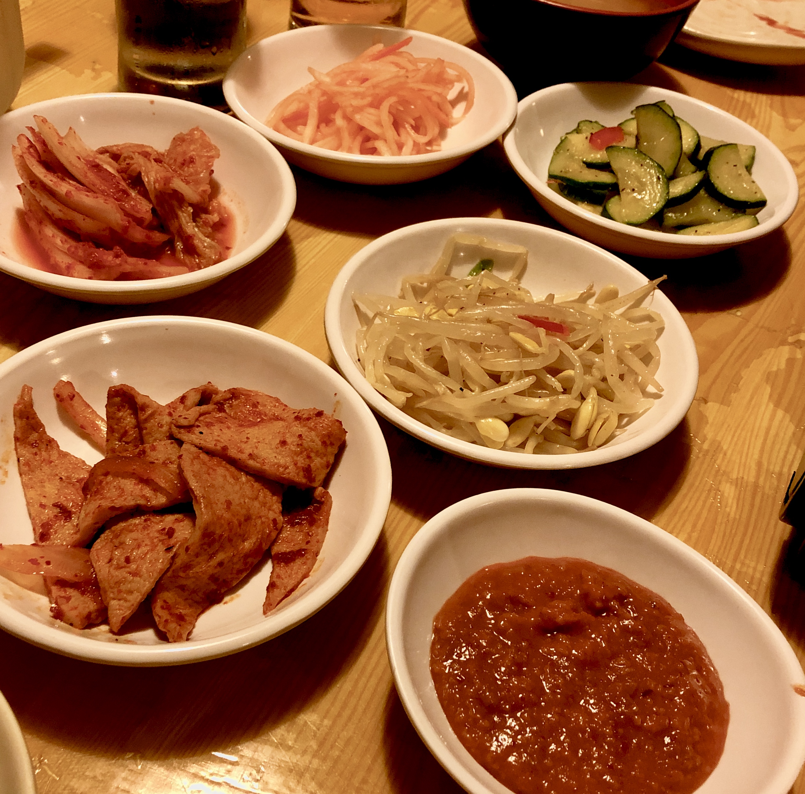 I’m going to be honest, we were pumped about the kimchi, which didn’t disappoint, but our eyes were open to a whole new world of Korean cuisine in the process. The menu was daunting, so we opted to get suggestions from our server who hails from Seoul. He guided us in the direction of two raw beef dishes that we could cook on a grill at the table, and a very spicy octopus noodle dish. Alongside this order, we each had a small soup and five plates of pickled vegetables and fish, one of which was kimchi.