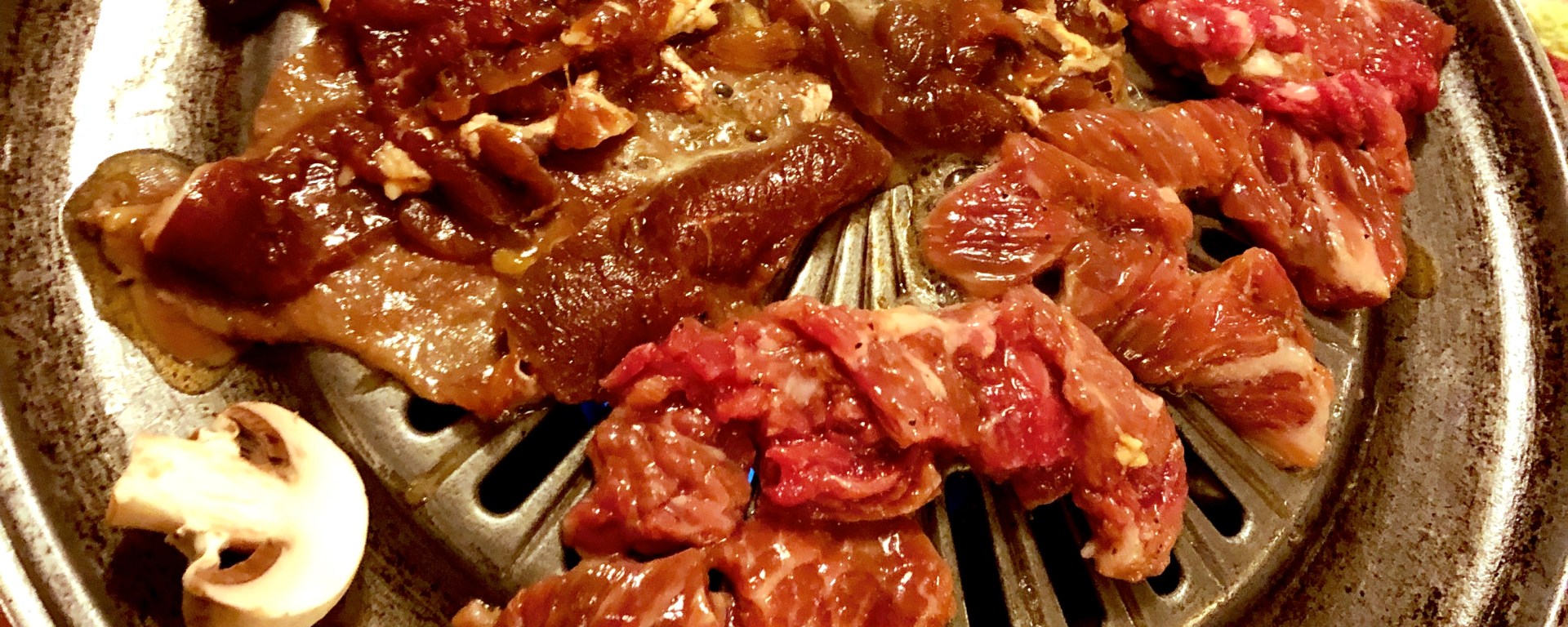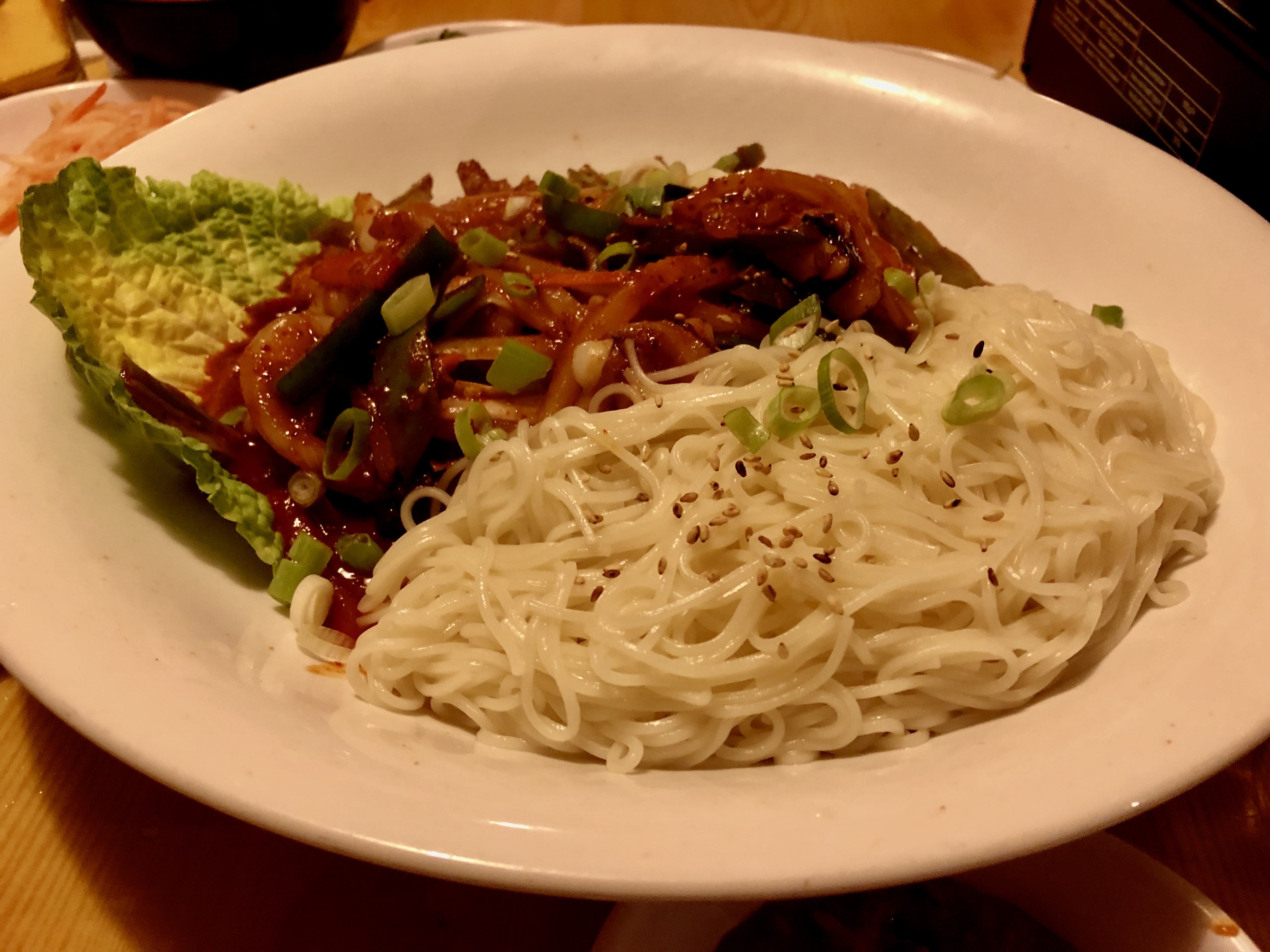Our dinner guest offered to man the grill and each slice of beef was cooked perfectly. Of the two beef dishes that we ordered, one was thinner and the other was thicker with more fat. The general consensus was that the fattier dish Gal Bi, took the prize for our favourite meal of the evening. A bonus of the Gal Bi and Bul Go Gi is that a sauce made of soybean paste comes with it. Although we tried our best to ration it, the entire bowl was gone before half the meat was cooked.