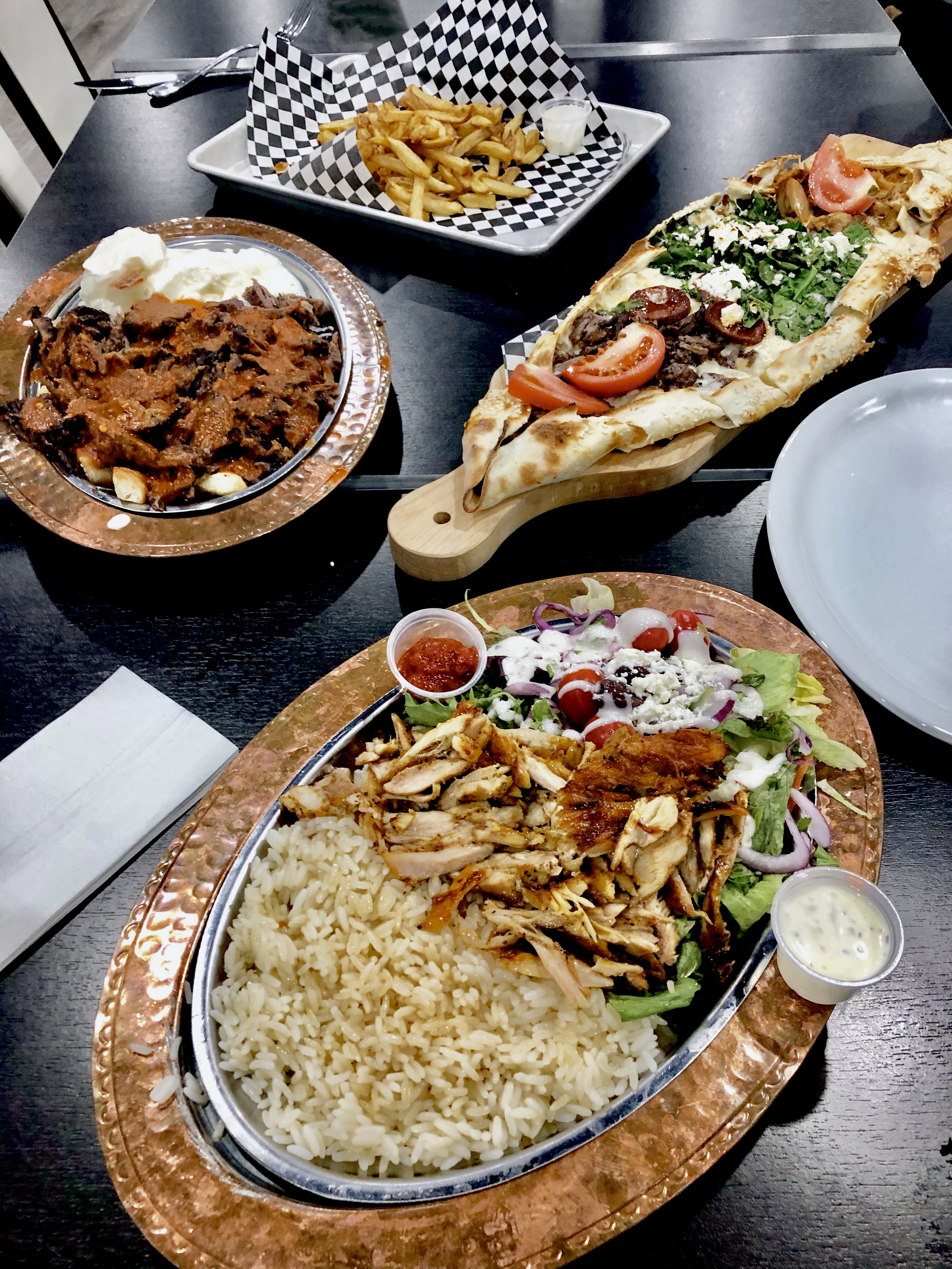 We opted to go big or go home with a double order of french fries and an addictive yogurt sauce riddled with garlic to keep us busy as the larger plates made their way to the table. The group pounced on the Mixed Pide which is a pizza-like flatbread topped with chicken, beef, spinach and mozzarella cheese. I don’t know what they do to make the bread base, but it’s incredible, almost as if it melts in your mouth.