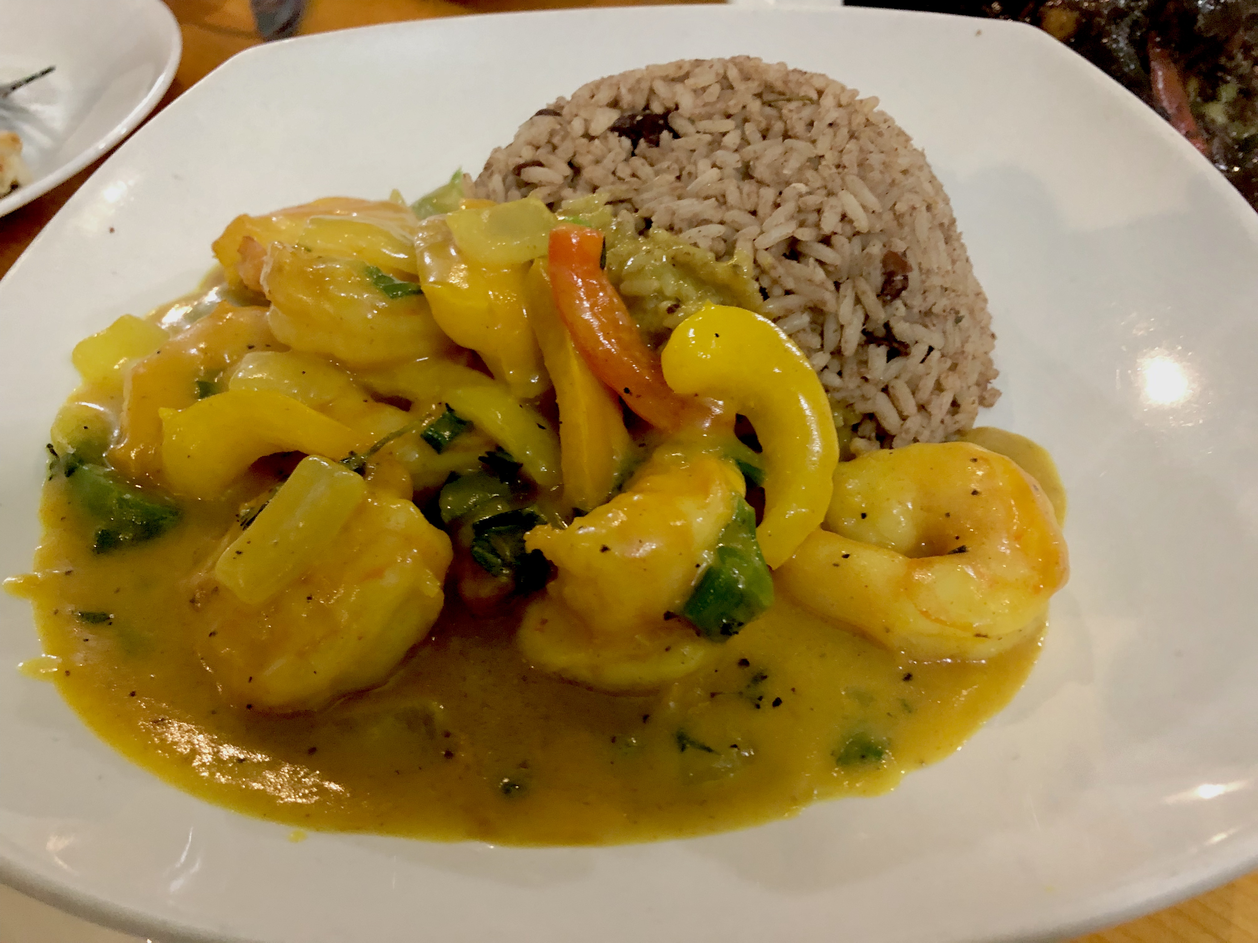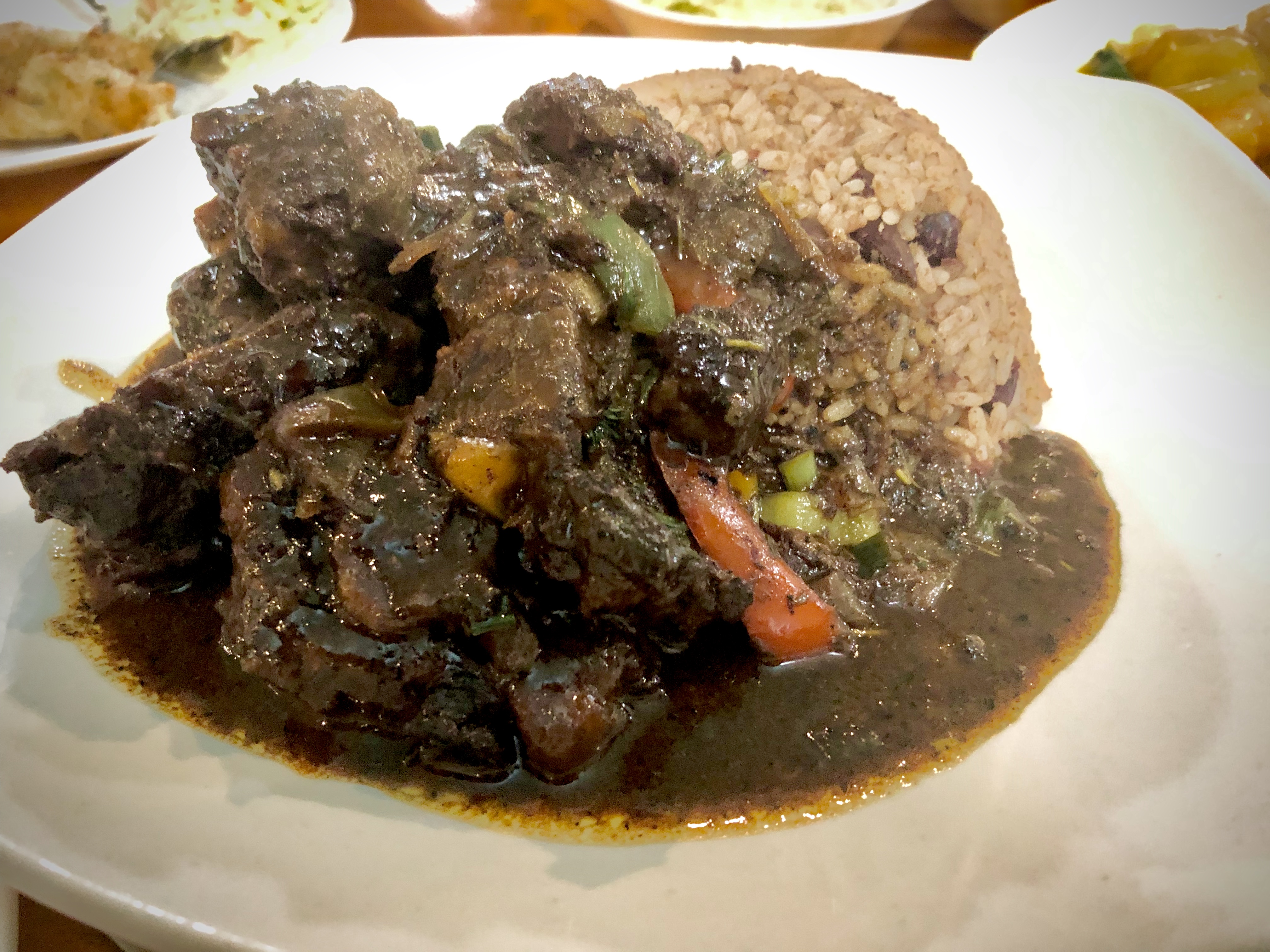Our four main plates consisted of the obvious jerk chicken, braised oxtail, johnny cakes, and the shrimp curry. Another visit is necessary to get some curried goat in… Everything was served in generous portions including some side orders of rice and peas to accompany the protein.