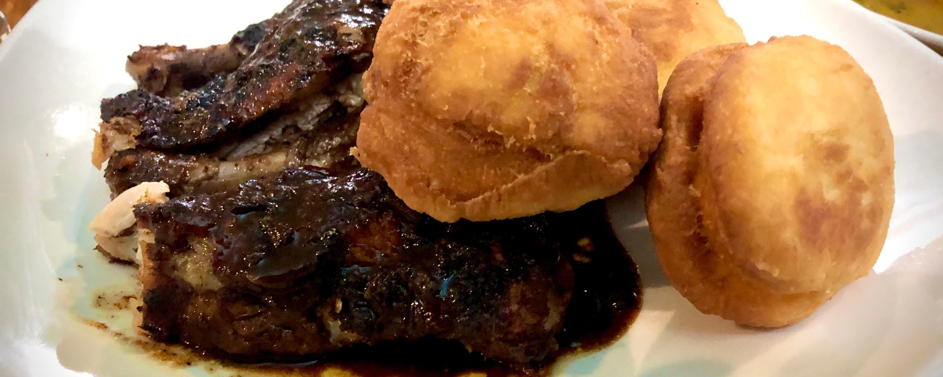 Our four main plates consisted of the obvious jerk chicken, braised oxtail, johnny cakes, and the shrimp curry. Another visit is necessary to get some curried goat in… Everything was served in generous portions including some side orders of rice and peas to accompany the protein.