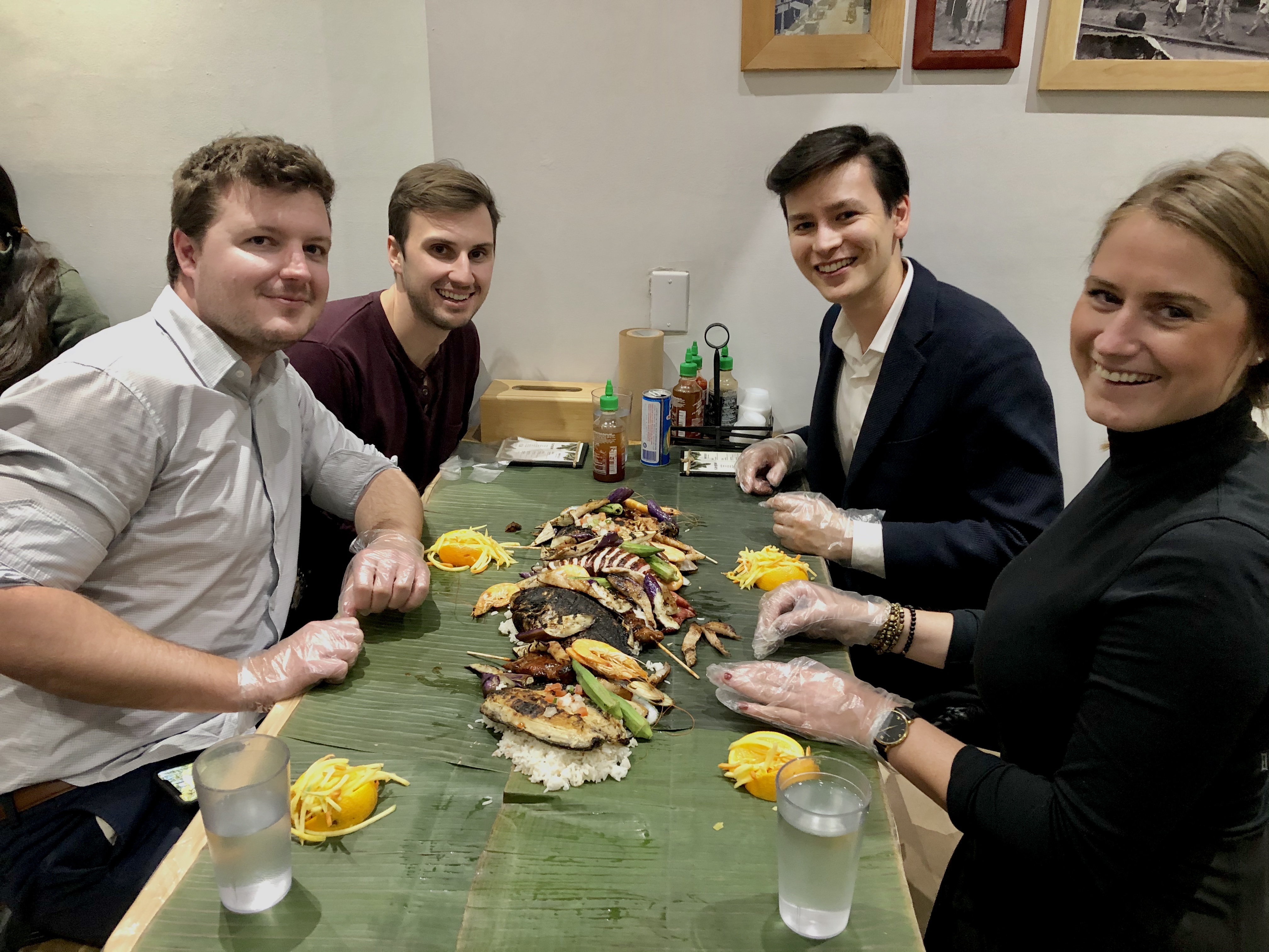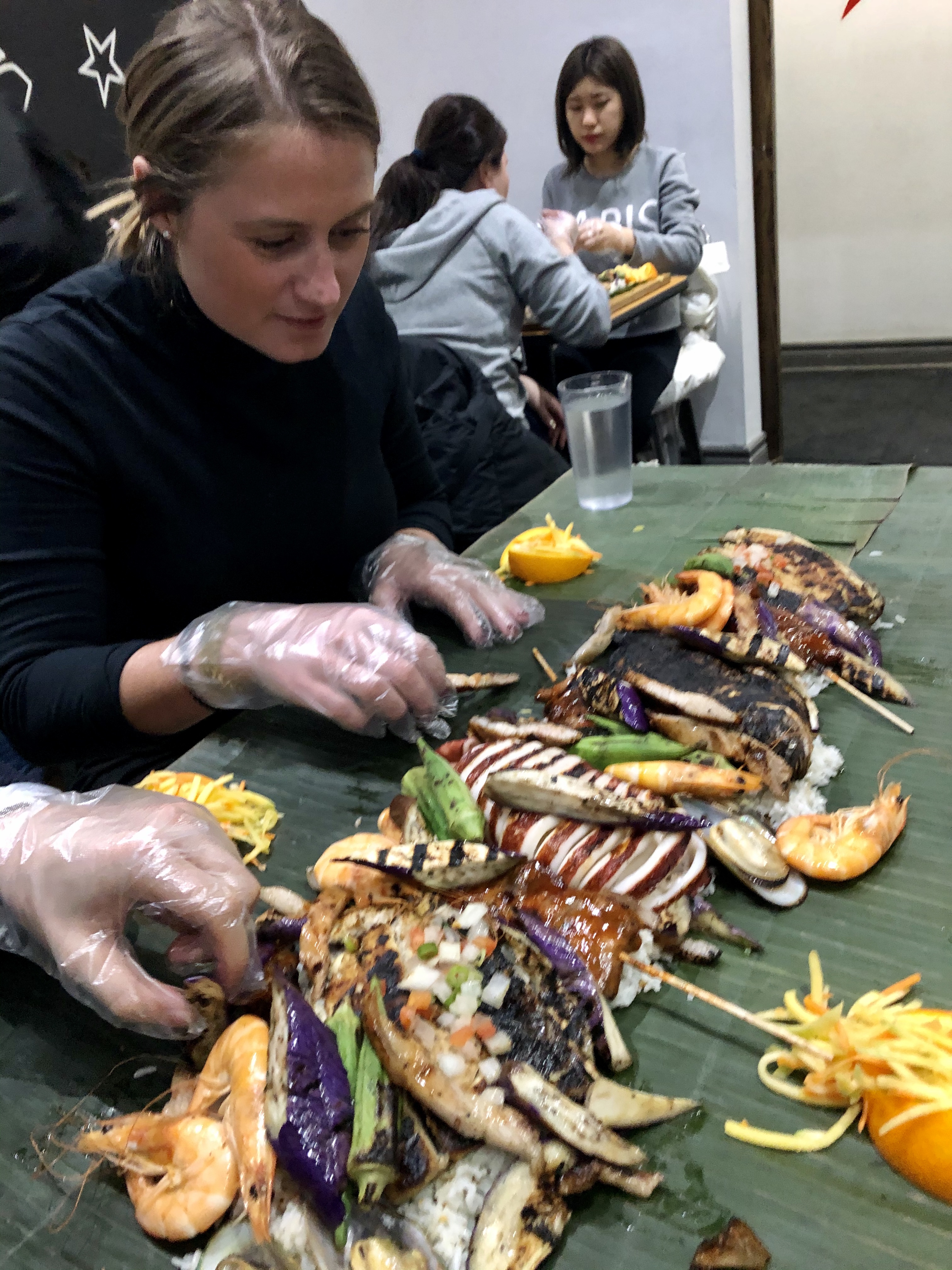 Although our table was prepared with the traditional banana leaves acting as a plate, or even a table-cloth, we weren’t quite ready for the speed to which our feast arrived, and was displayed on our table. The rice was laid down with a petite paddle on the leaves in a mountain across the entire width of the surface, giving easy access to everyone to have their fair share of bites. However, the show-stopper was the decadent display of grilled seafood, meats and vegetables that topped the garlic infused rice. It tasted as good as it looked, trust us.