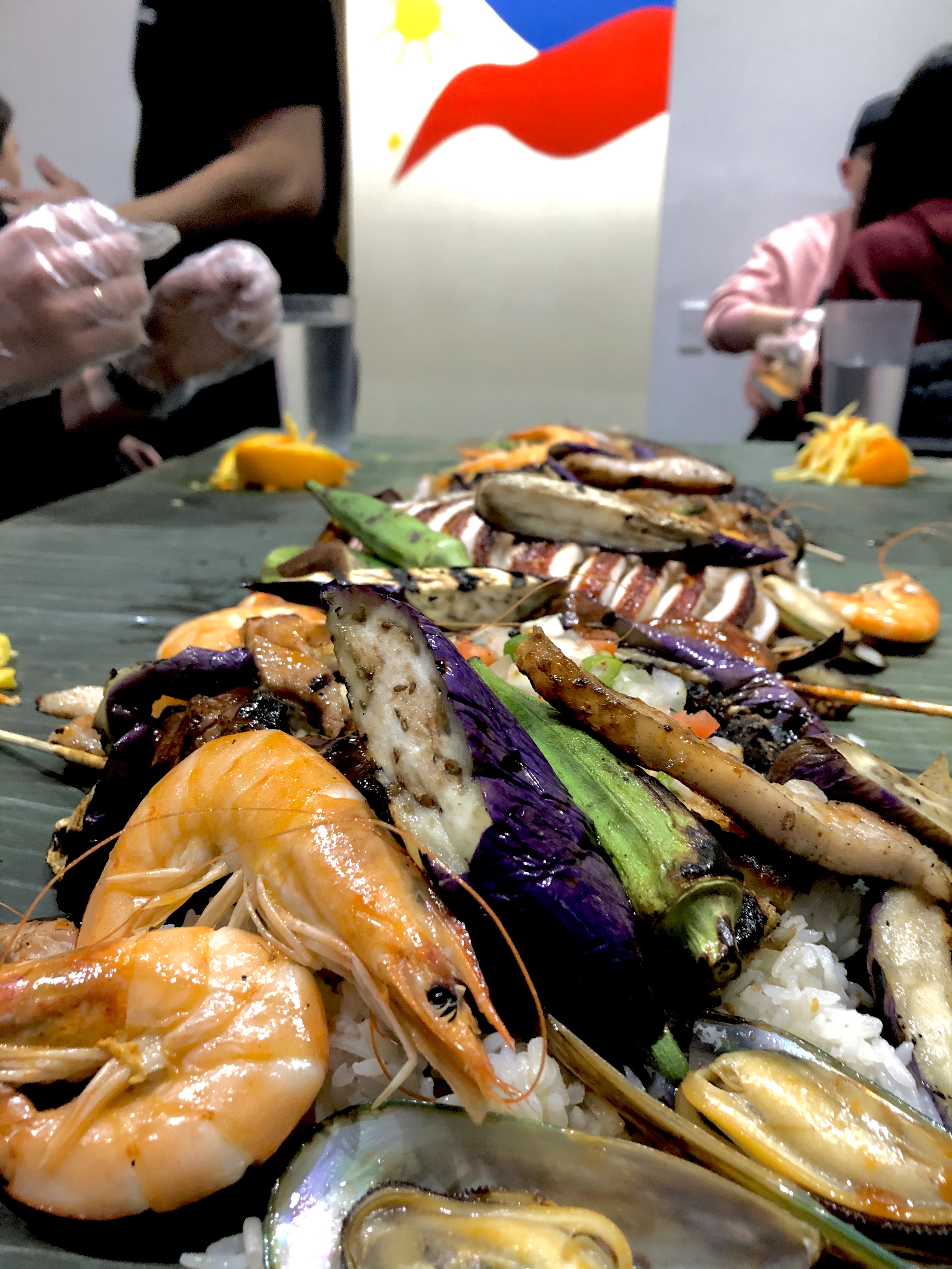 The generous serving of seafood medley included prawns, mussels, squid, tilapia and milkfish, which is a popular fixing in the Filippino food scene. There were smaller portions of pork and chicken on skewers, as well as eggplant and zucchini. It seemed like a lot of food, but it’s all portioned for the amount of people at the table, and despite being full, it was difficult to stop eating the rice once the more colourful items were devoured.