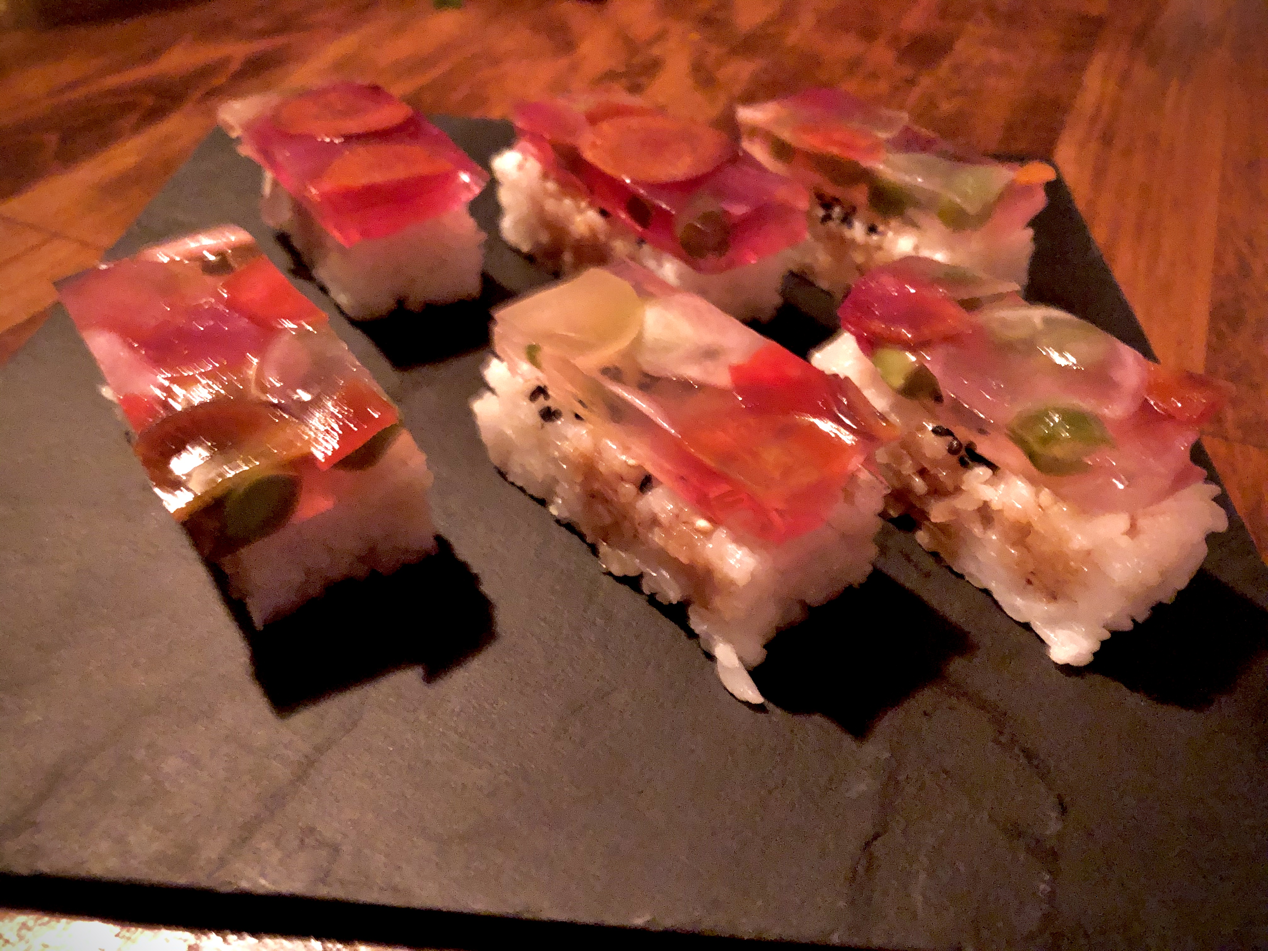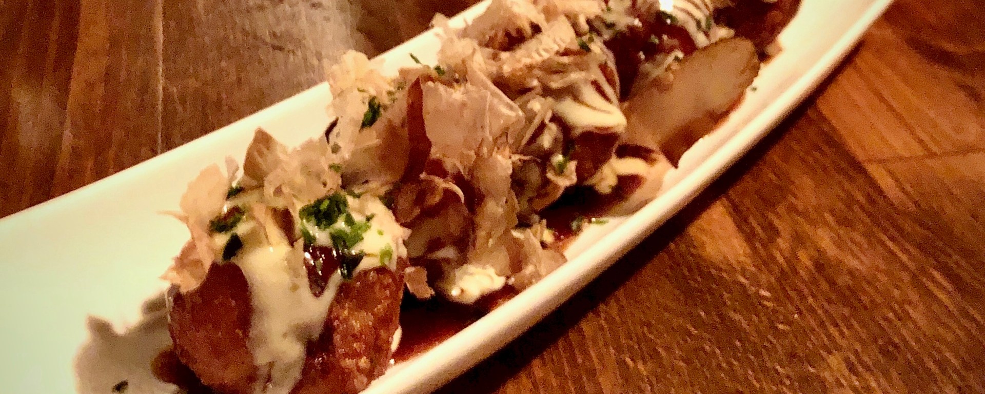 This is the second time the Mat/t’s have eaten at this establishment and both of their experiences have left them wanting more. As we ordered several dishes we decided to include two must-try dishes of the night: the Oshizushi, salmon or saba (mackerel) and the Takoyaki. The Oshizushi is blowtorched fish pressed sushi, we recommend both. This sounds very simple though it is well worth it and we were all blown away by the charred taste of the fish. In contrast, the Takoyaki are octopus balls with tonkatsu sauce and karachi mayo.