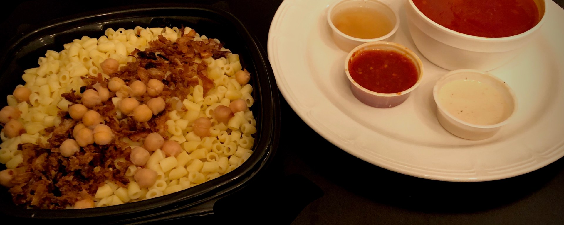 Among all the tempting smells in the street stalls, something that always satisfied her hunger was koshary. This typical dish is the classic Egyptian street-food, and you can find it on most corners. On the surface, it seems like a random medley that mixes staples you have in your cupboard (lentils, chickpeas, rice, macaroni noodles), but you only have a little of each and not enough of one for a whole meal. Once it’s blended with garlic and spices, the carbs are topped with crispy onions and tomato sauce.