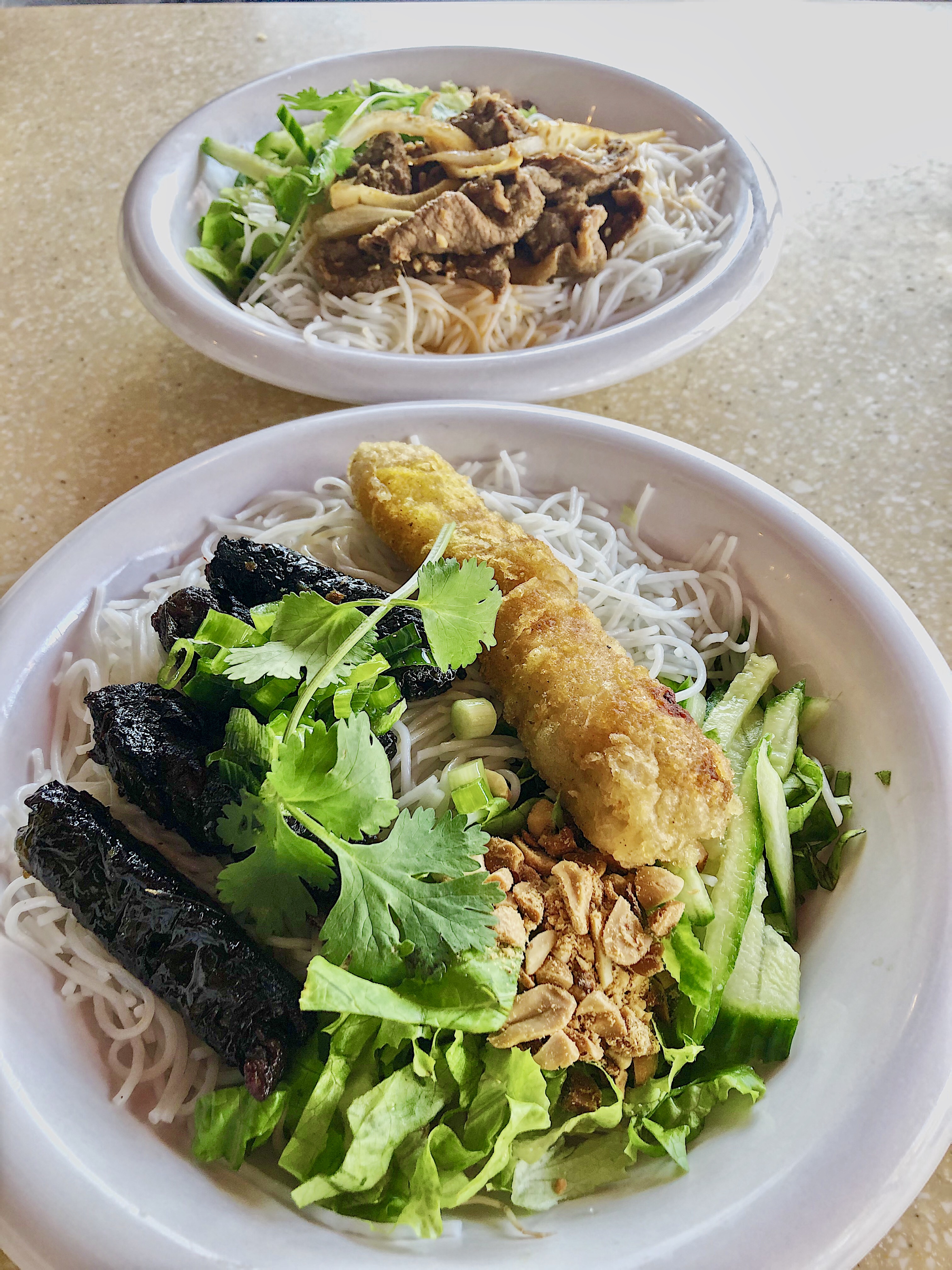 As Andrea is a regular at this eatery, she helped guide Mat through the menu and the duo ended up getting the #65 Spicy Beef Satay and Lemongrass with Vermicelli and the #85 Grilled Herb-wrapped Beef & Springroll with Vermicelli. Once in front of you, it’s up to your palate to choose the sauces to season the dish. The beauty of both meals is that they are both great without adding any additional toppings, but not surprisingly, Mandrea Bike is a bit saucy and couldn’t resist doctoring them up with hoisin and hot sauce.