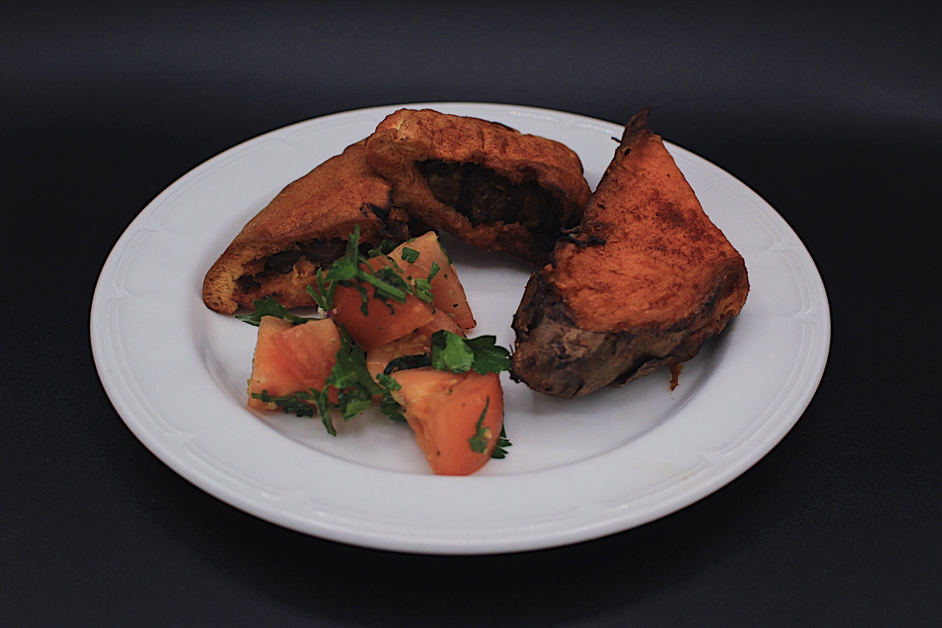 The final dish was the Arais, which is lamb and beef stuffed pita quarters served with, surprise surprise, tahini! It was accompanied by half a roasted yam and a spicy tomato salad. The Arais was reminiscent of an Isreali burger, but better.