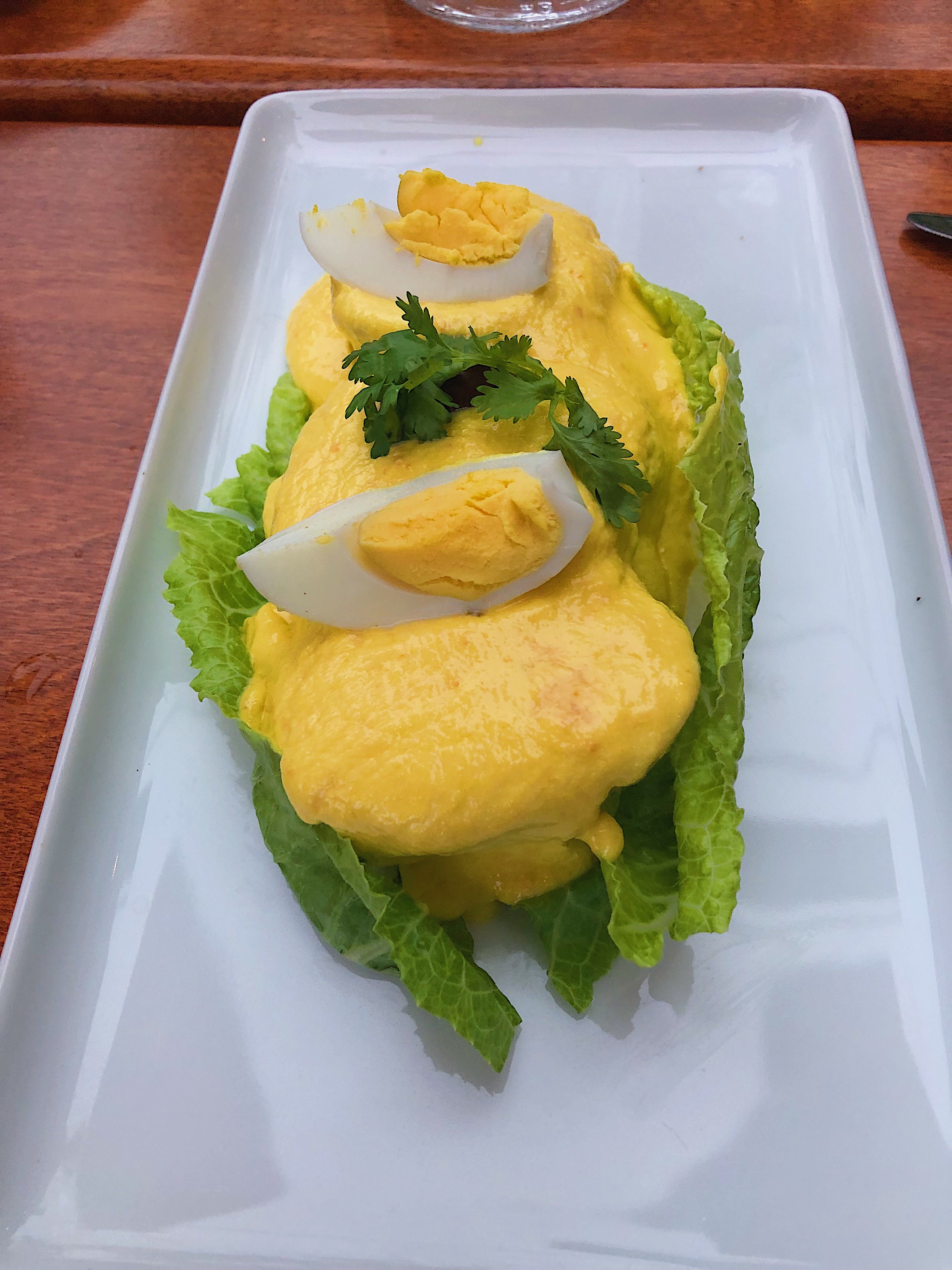 - Papa a la Huancaina: A dish hailing from Huancayo in the Central Andes – where Andrea spent a month teaching English and a plate that Mat ate a lot during his travels. The base is yellow potatoes and hard-boiled eggs covered in a rich cheese sauce. It feels like a Peruvian version of a potato salad.