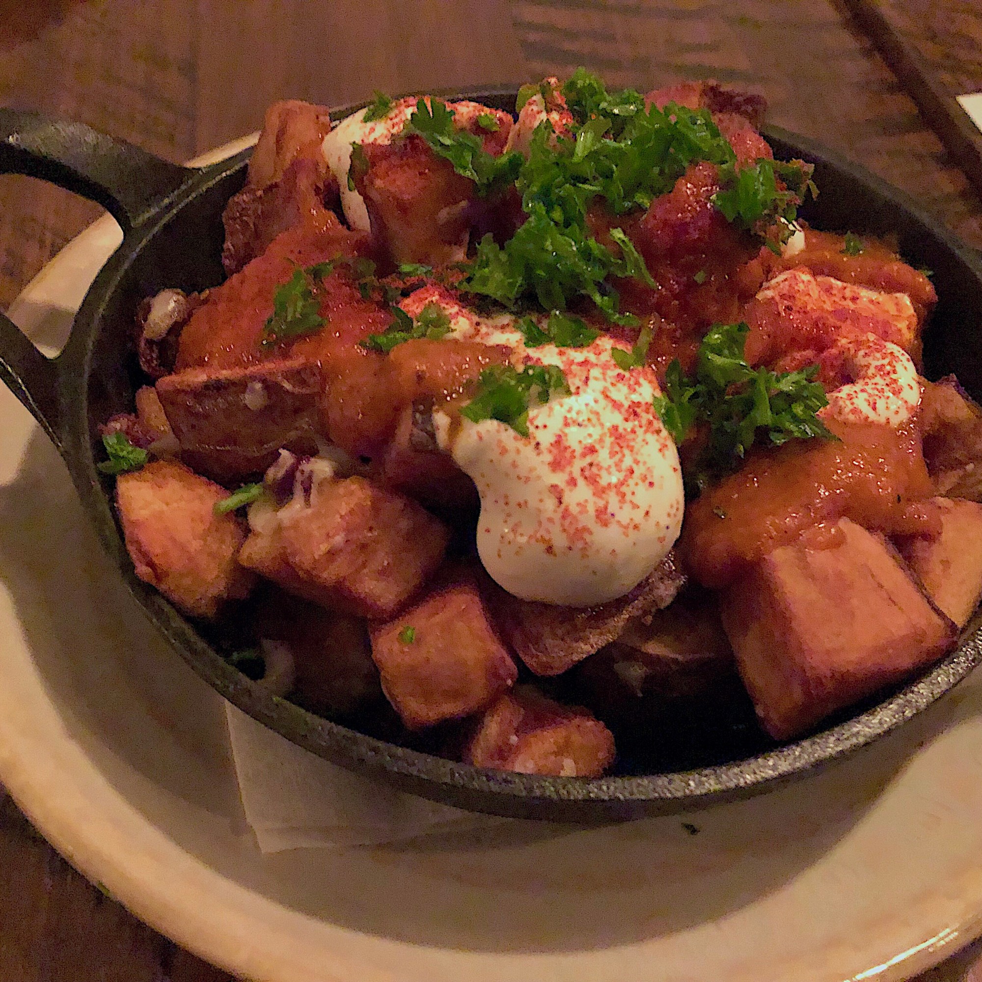 Mat’s recommendation that’s native to Madrid in Spain, Patatas Bravas, followed. It’s essentially fried potato cubes served in this case with kalamata olives, creme fraiche and roasted red peppers. Just delicious.