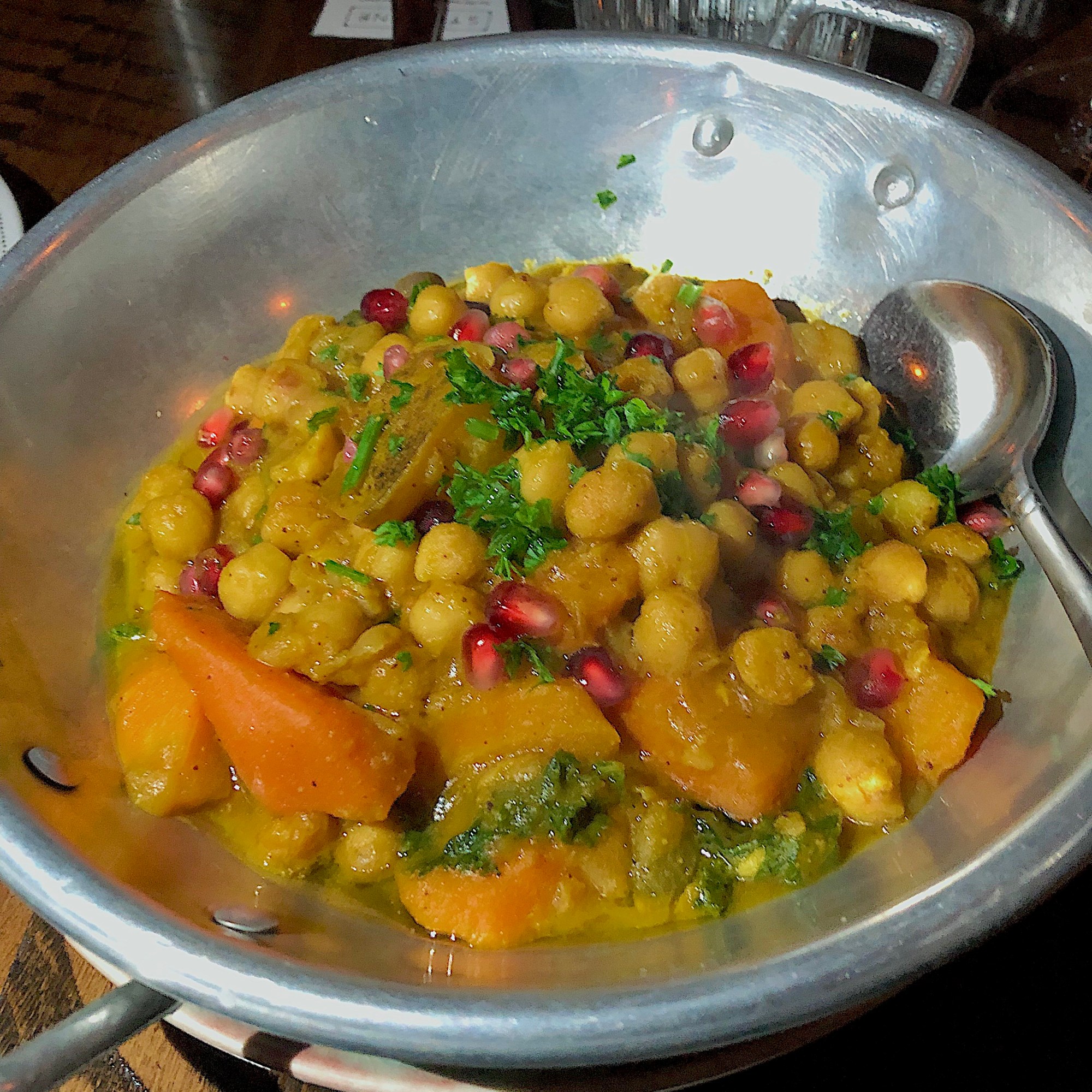 The final dish of the night was the Vegetable Tagine. For those who aren’t familiar with tagine, it’s actually cookware and not a dish or recipe. The tagine is native to Morocco and other Northern African countries and is traditionally built out of clay. The idea is that as the dish cooks, the evaporation rises and then falls back down into the food, creating a self-basting, flavour-enhancing cycle of deliciousness. Bar Sybanne’s tagine included chickpeas, seasonal vegetables, and abricots that was topped with pomegranate seeds.