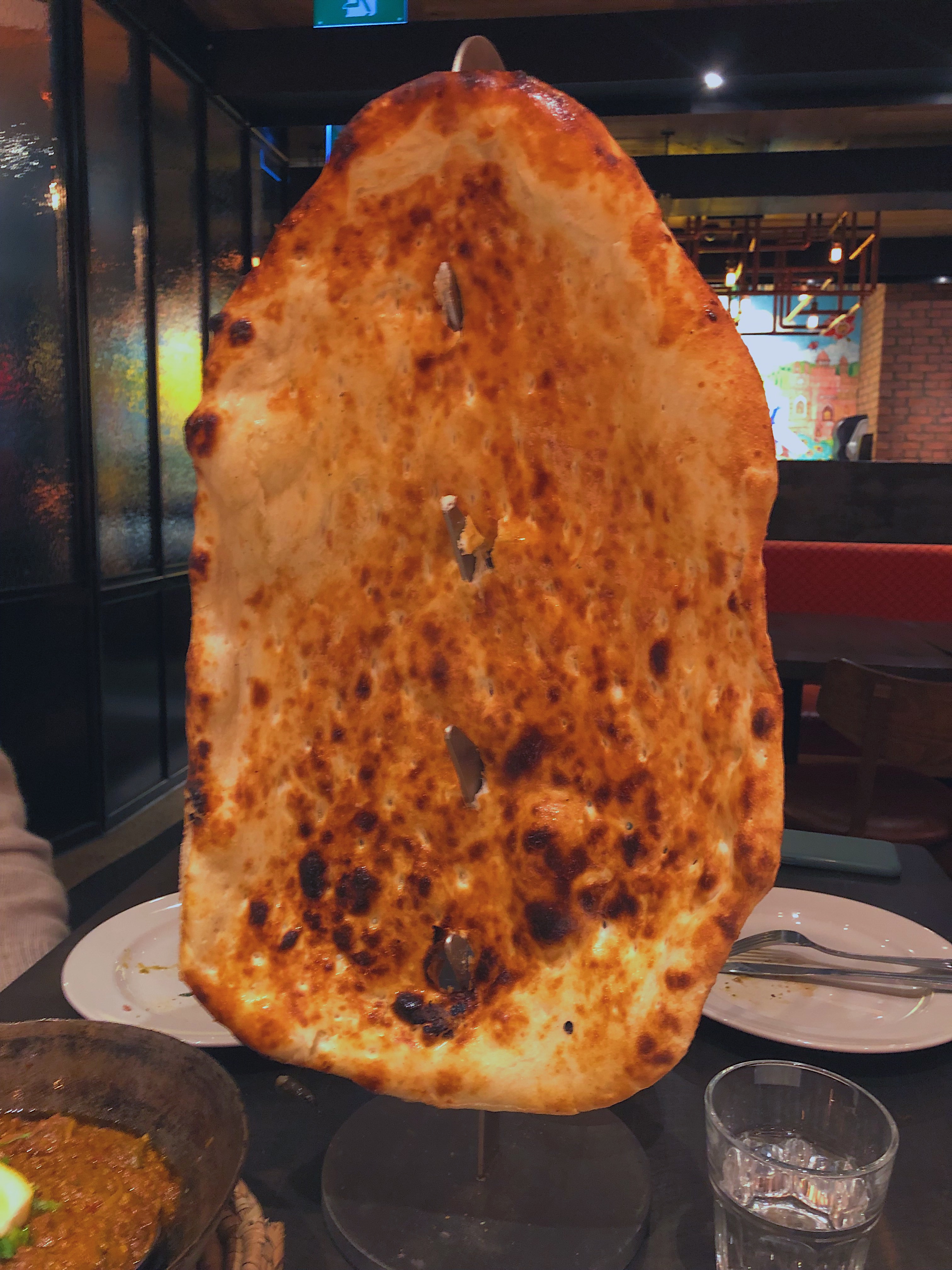 All the karahis were cooked with medium spice levels. To accompany the stews, two family-style naan portions were ordered and served to the table in a majestic way – the bread was large, fluffy, warm, and presented as if it were on a tree. You may have to see it to believe it!