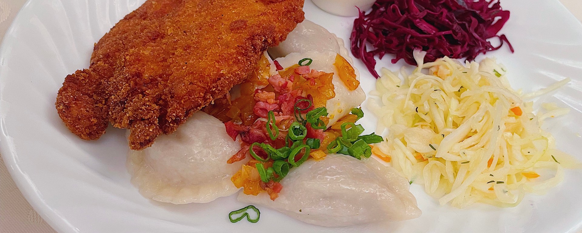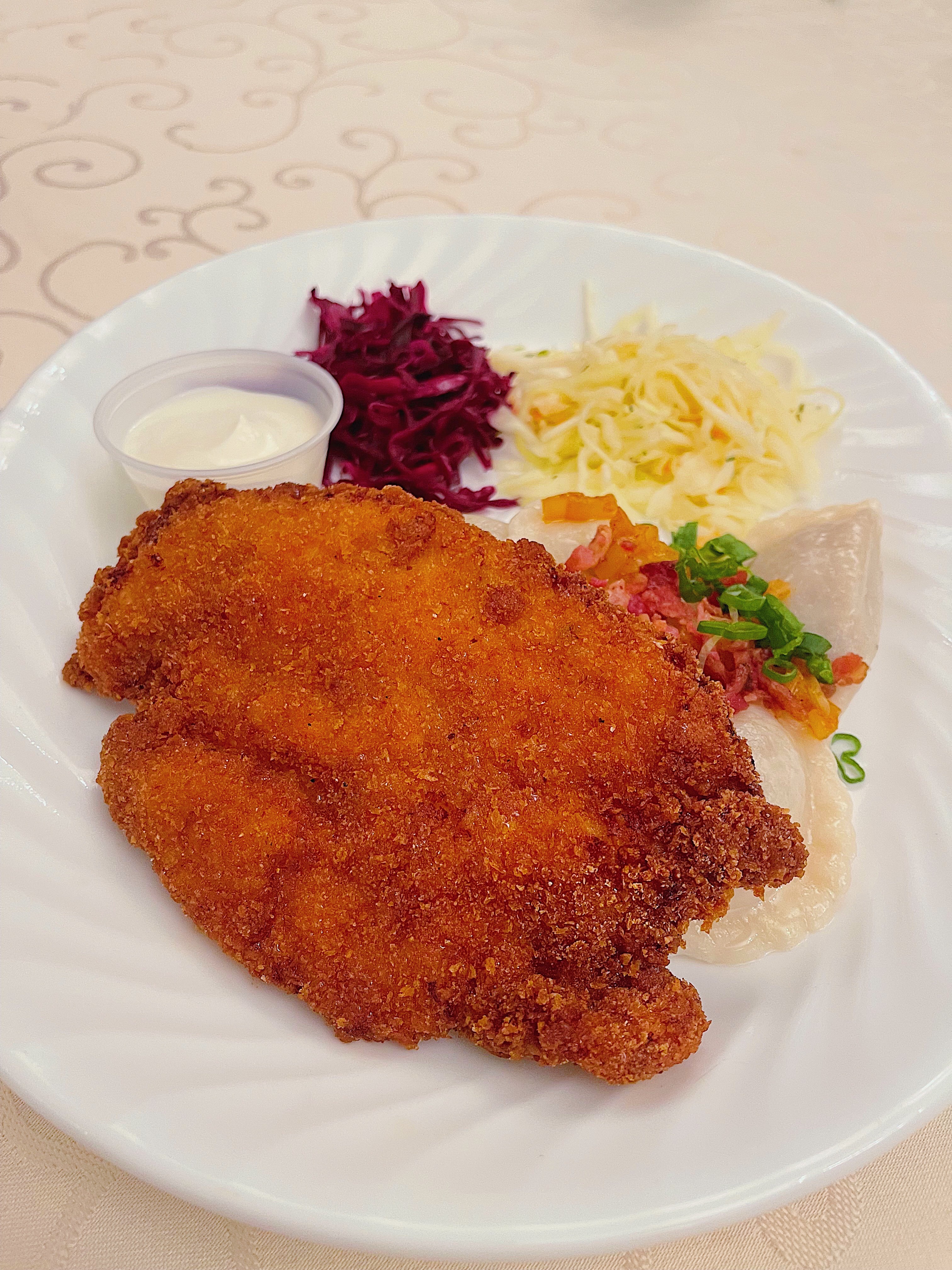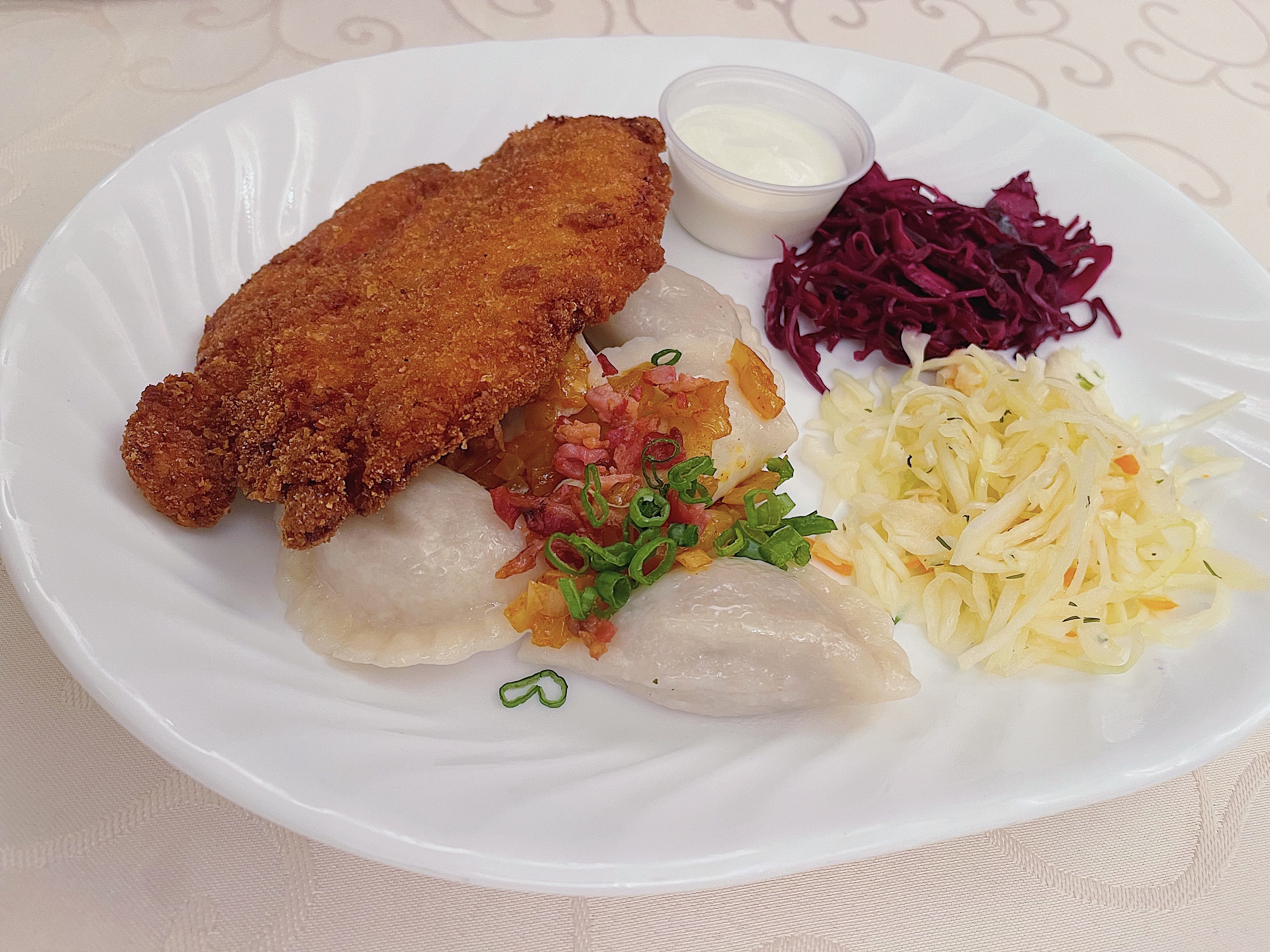 Must-try dish: Chicken Schnitzel with Perogy and Coleslaw