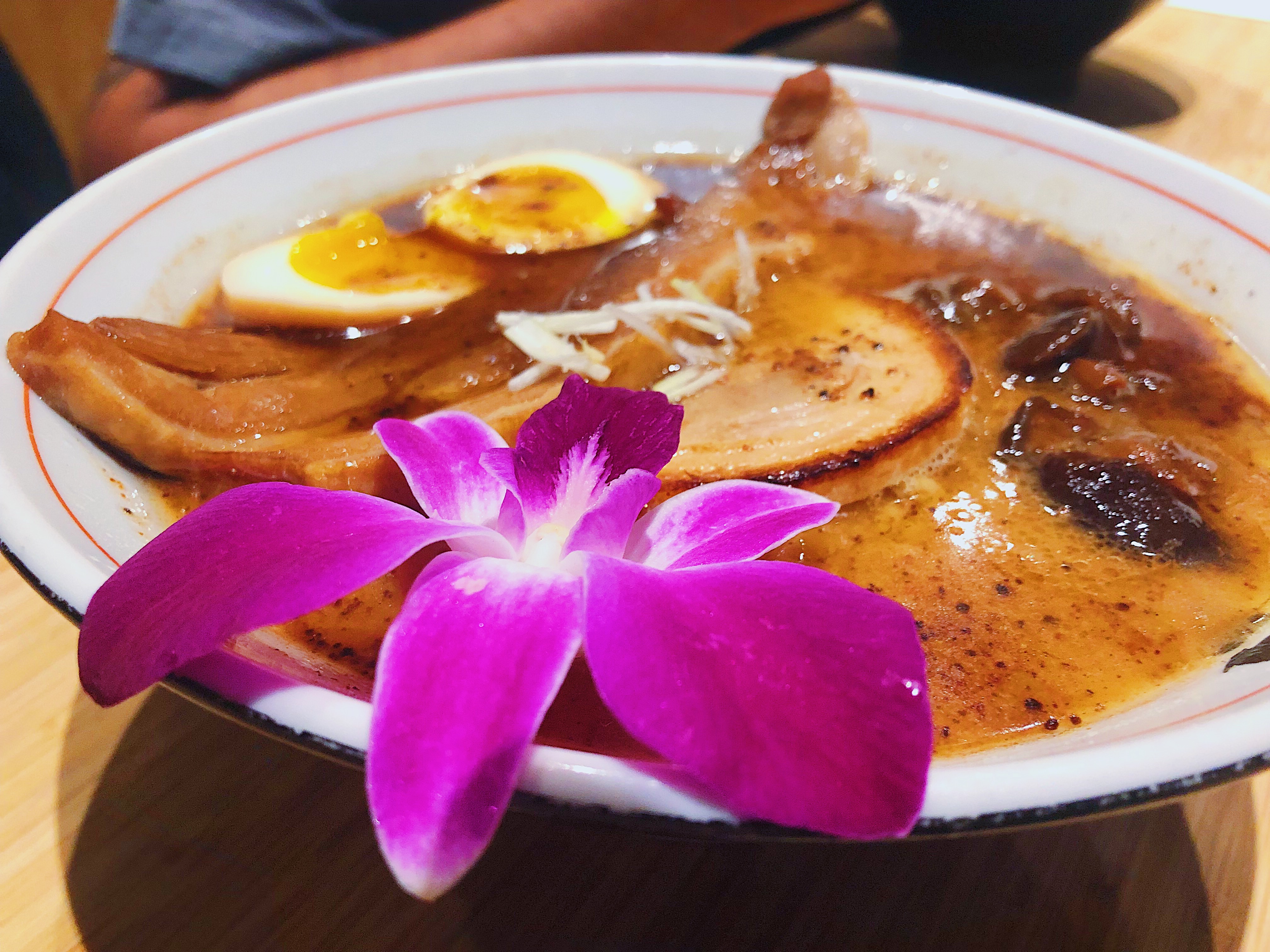 Since soup isn’t the most sharable dish, the gang ordered their own bowl according to personal preference. The Miso Black was the fairest of them all as it’s served with a gorgeous edible flower on top of broth swimming with spicy braised pork (kakuni), shitake mushrooms, a seasoned boiled egg, and garlic oil.