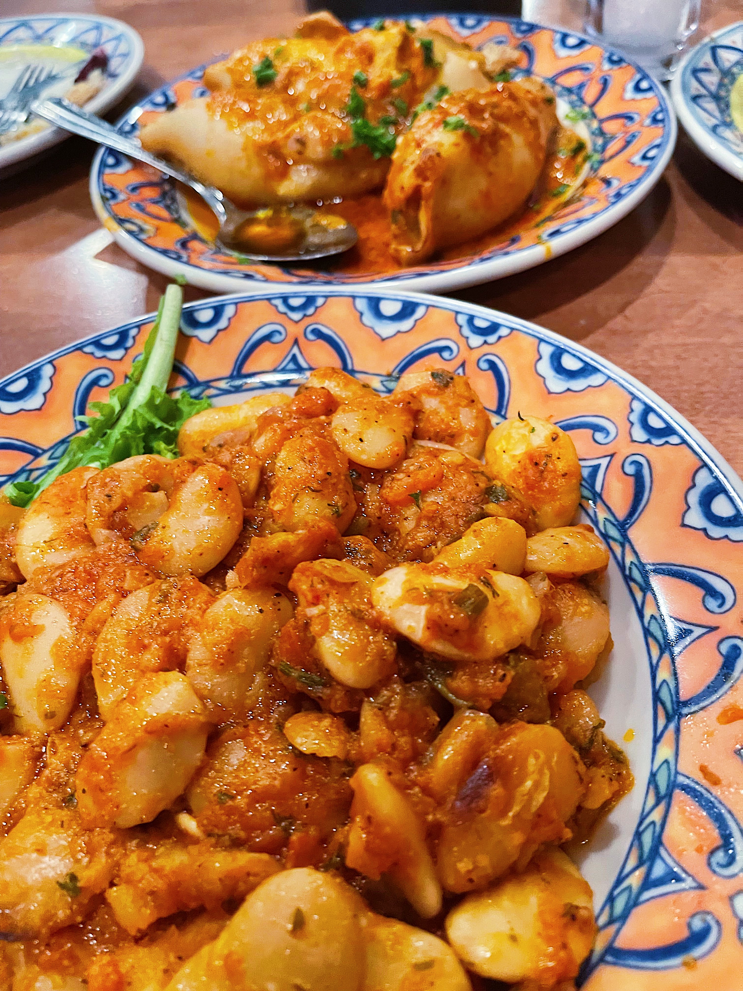 The Gigantes are a stew of massive white lima beans cooked in a fresh tomato sauce with herbs and vegetables. This was an excellent option to steer away from the fish and meat dishes that were to come later in the meal. It was served alongside the Mousaka, which was unique in its own right from the more common ones found around the city perhaps because of dominant cinnamon or nutmeg presence in the bechamel sauce that covered the layers of eggplant, ground beef, and zucchini slices. Mousaka is Greece’s version of lasagna… Or is it the other way around?