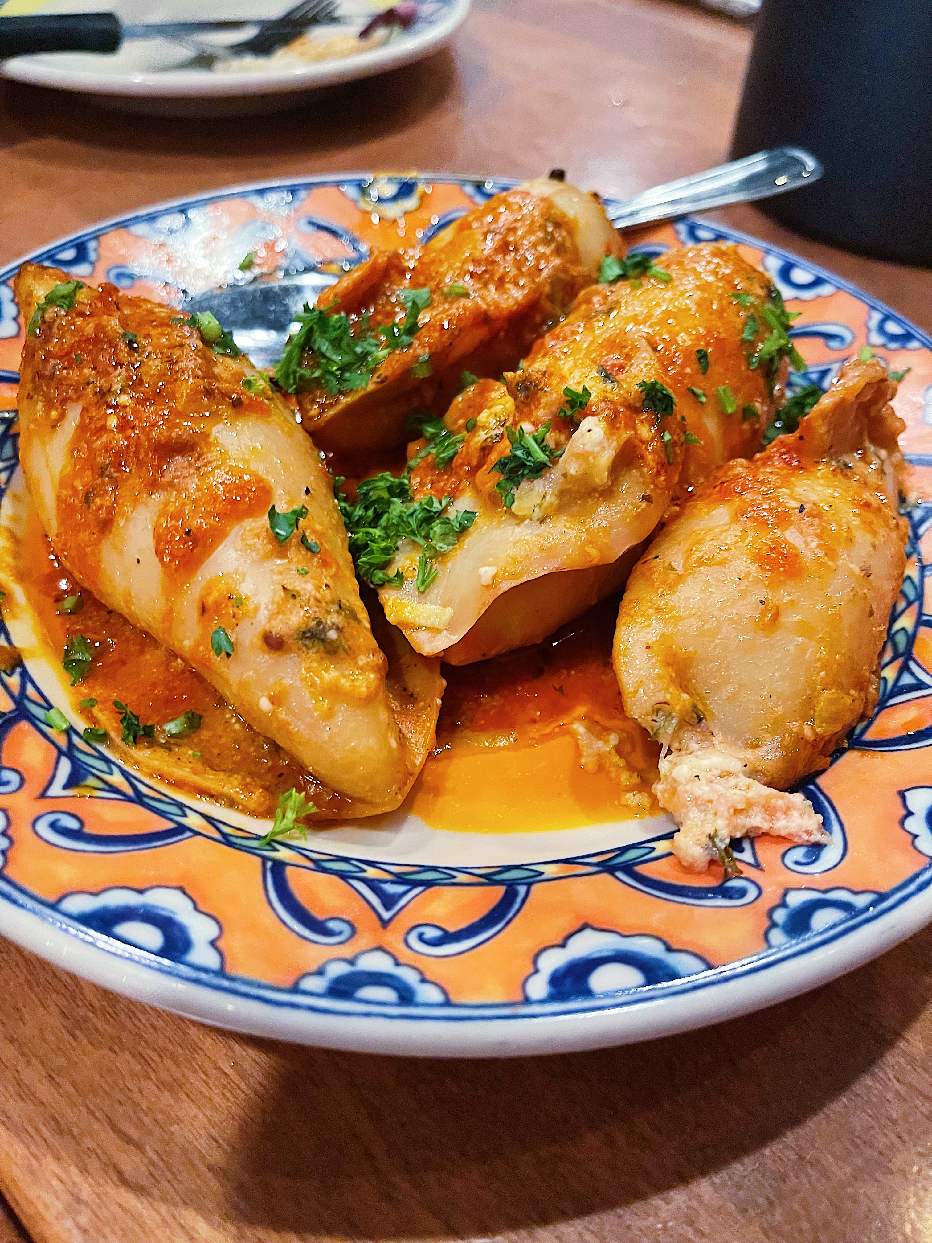 The next wave of dishes included the Kalamari Gemisto, which is perhaps the best calamari in the city. This perfect specimen is stuffed with feta cheese and herbs and topped with tomato sauce. It’s mouthwatering, and the entire group agreed that it will take a long time to forget this dish, if forgetting it is even possible.