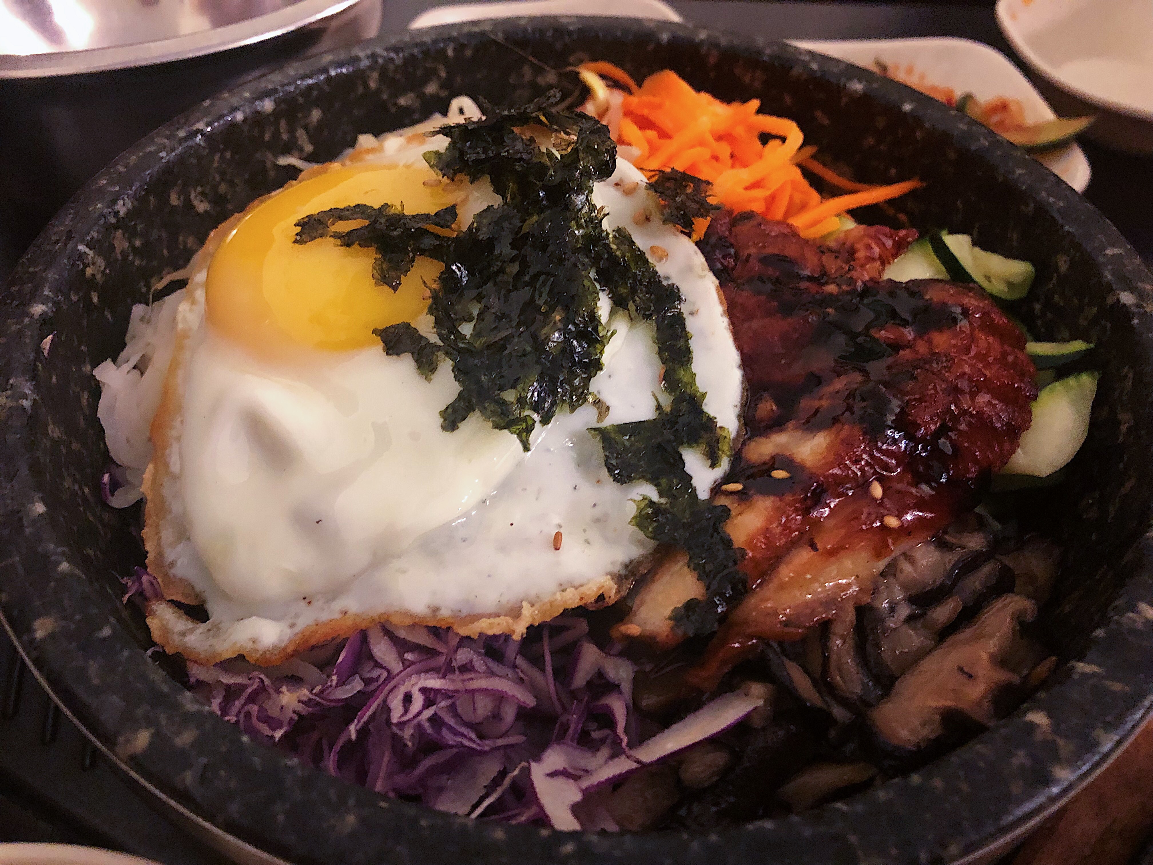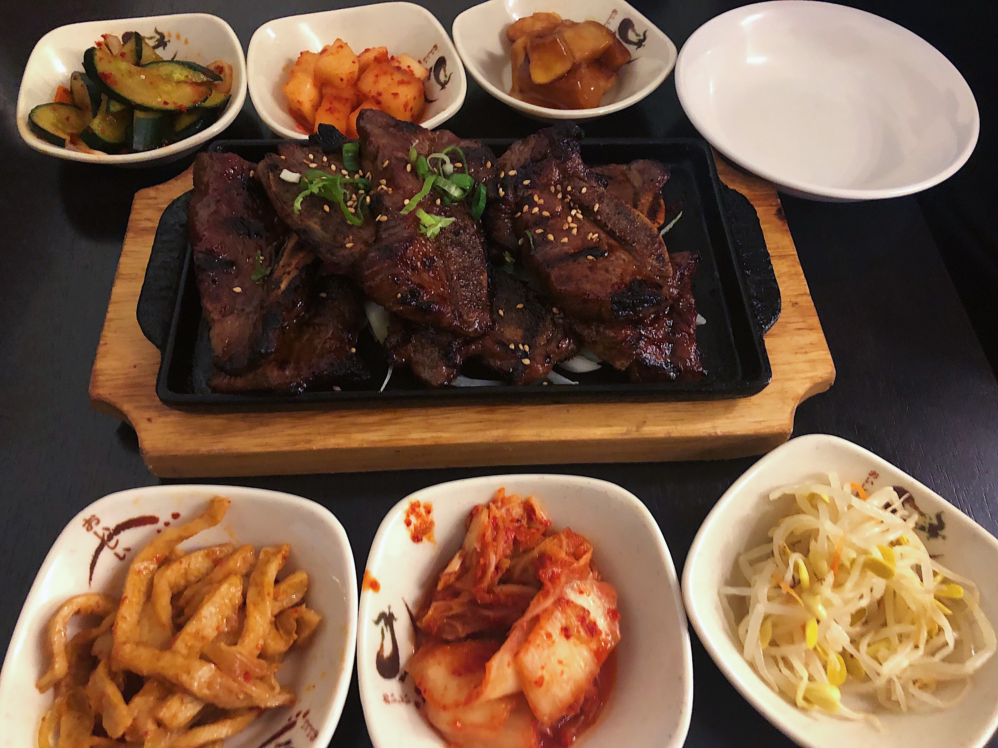 Despite the dinner rush, we asked our server for recommendations and were happy to learn that all the dishes on the menu are traditional South Korean recipes. She also was helpful in guiding us away from the more popular dishes for Canadian dinners (S17) Ttukbaegi Bulgogi – a marinated beef dish often grilled on the barbecue. We decided to be a little more adventurous and ordered the (D5) Beef Short Ribs Jungsik (for 1), which are meaty ribs dressed in a sweet and savoury house-made sauce accompanied with a bowl of rice. We ate the beef alongside the classic South Korean side dishes that are always promptly delivered to the table. These included Kimchi, a Cucumber Salad, Marinated Bean Sprouts, and three other bowls that were mysterious but delicious.