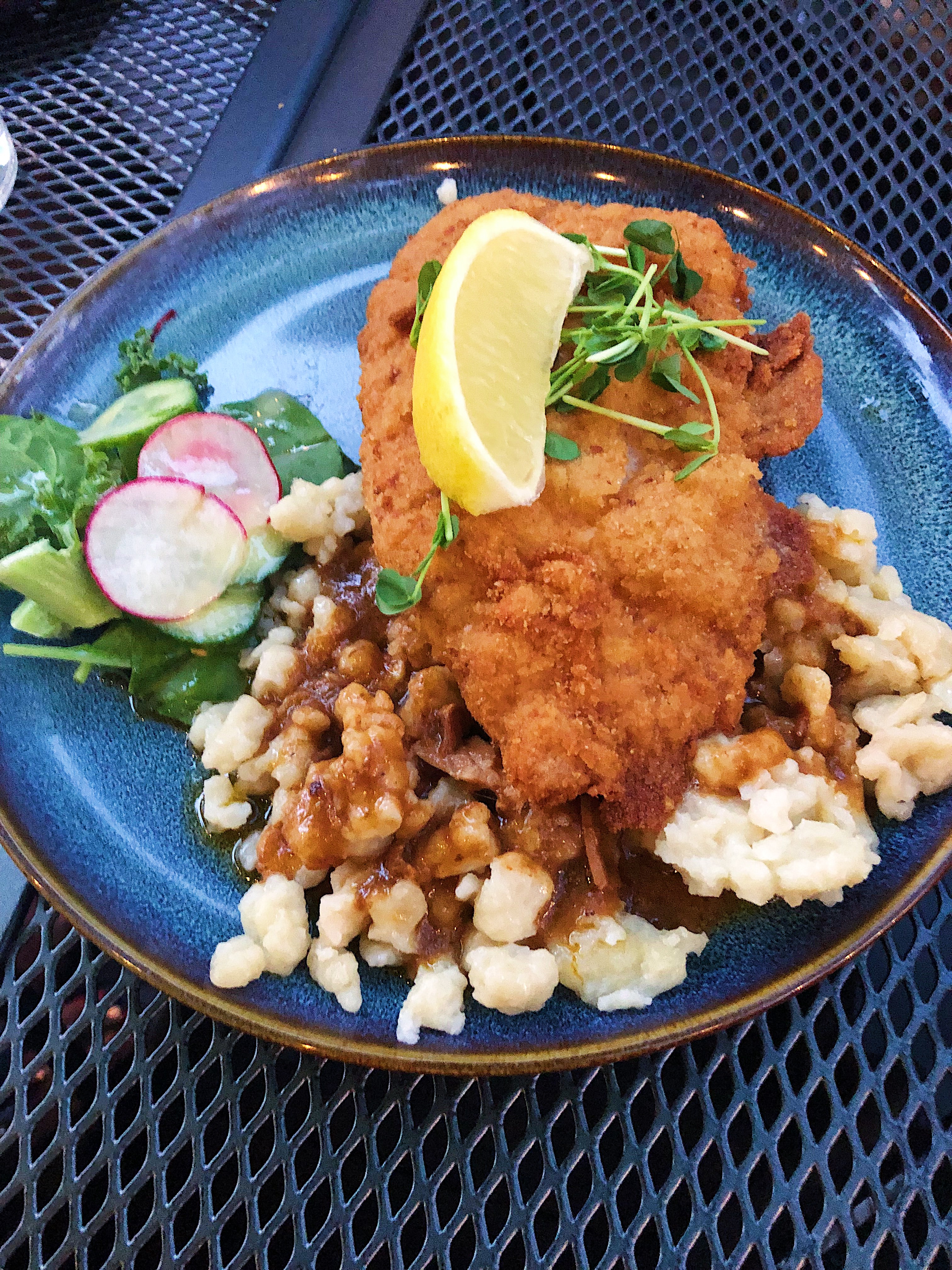 Our group came with a large appetite, so after the first round of orders, a final Schnitzel was ordered for the table. Our server recommended the Ham and Cheese Schnitzel and the Mushroom Schnitzel, but we ultimately got the Brie Cheese Schnitzel, which was magnificent. The generous piece of pork is flattened and covered in cheese then breaded and fried. It’s served hot with a side of your choice, we opted for the spätzle.