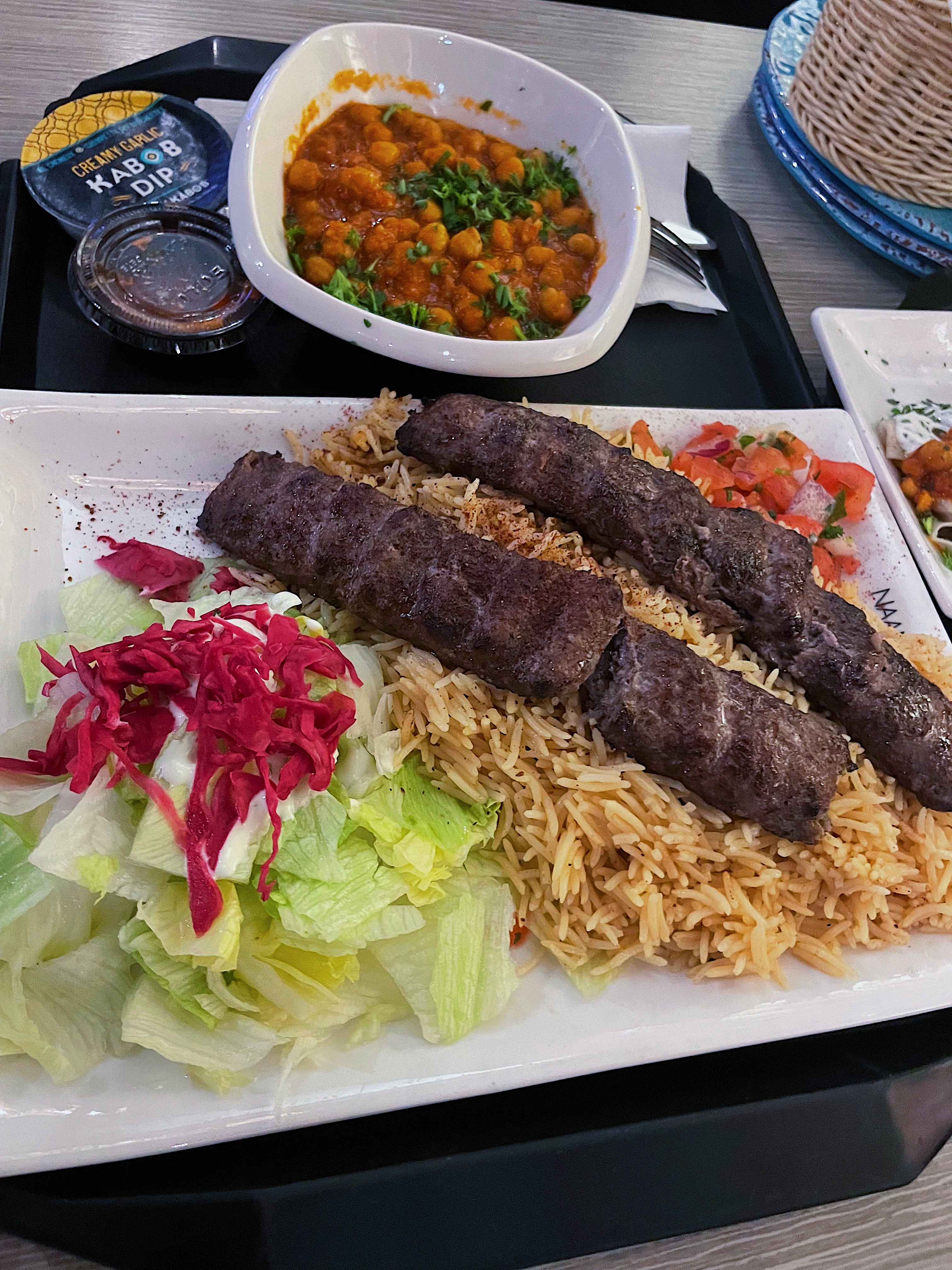 - Shami Kabob Din: This kabob dinner is one of many on offer at the restaurant. The iconic two ground beef skewers are seasoned with traditional Afghan spices then grilled. A salad, rice, and warm bread accompany the plate. This style of kabob tends to be our go to when you don’t know the cuts of chicken, beef, or lamb, as it will always come out juicy.