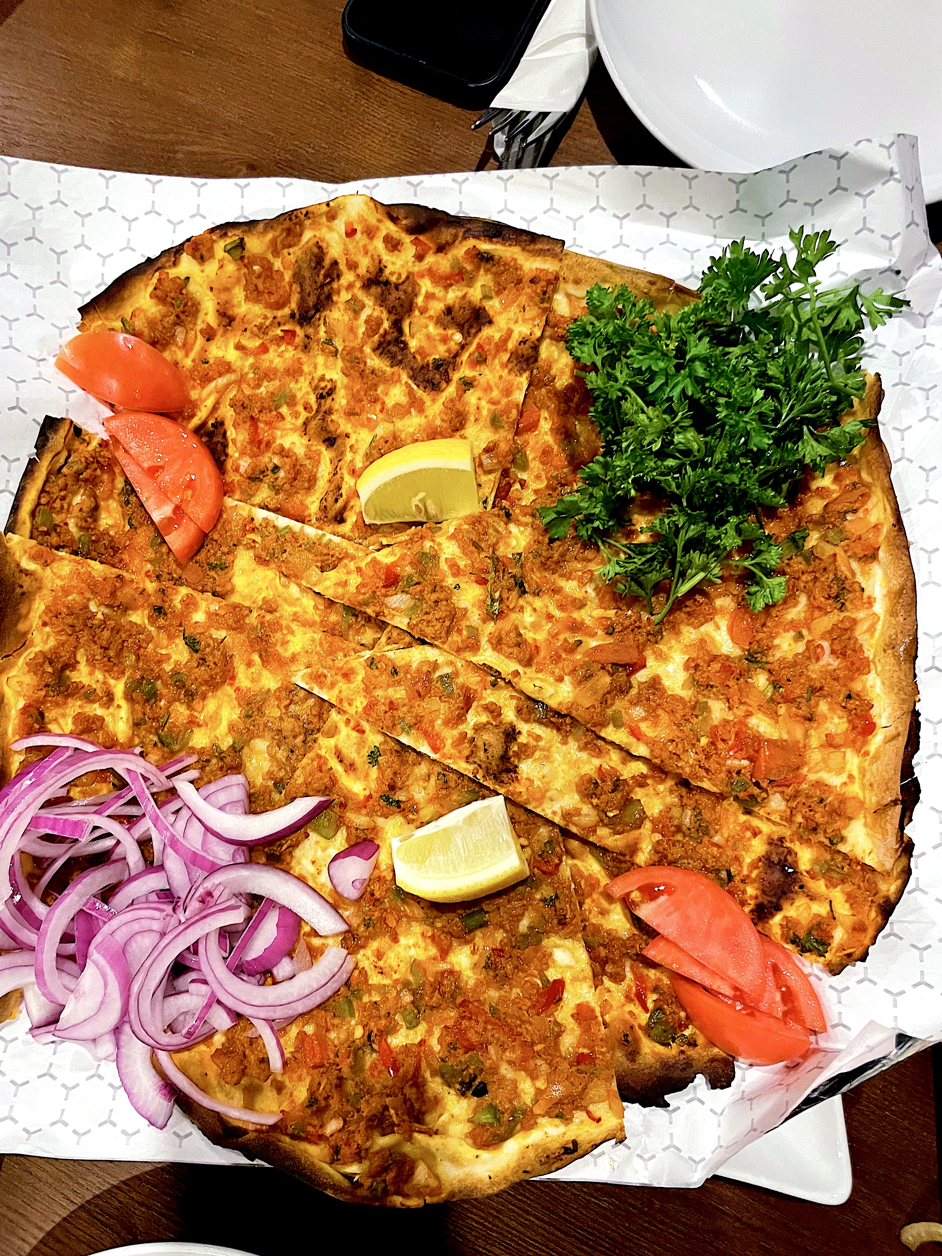 The Lahmacun Pide is the original pie most loved by Turkish people. The super-think crust is topped with sauce, minced meat and vegetables. It’s the perfect plate to share while waiting for the kebabs. There are several other topping options but we wanted to stick to being as authentic as possible.