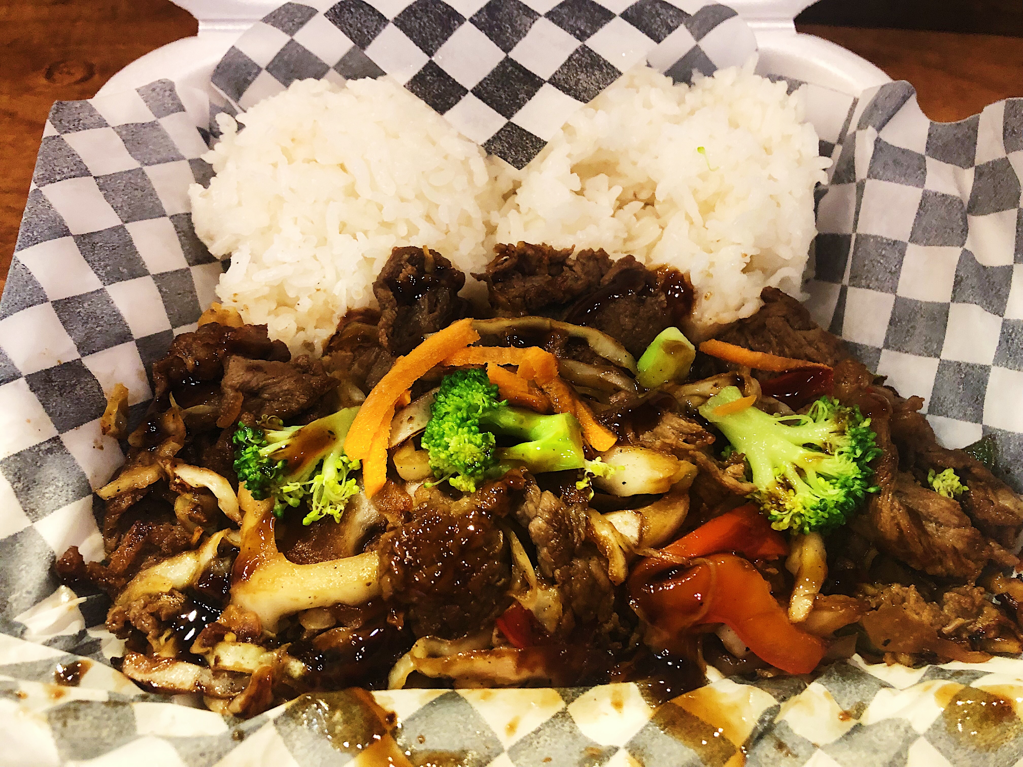 Bob’s menu is set up in a way that you pick a protein, a base, and the level of spice for your bulgogi. The proteins are beef, shrimp, chicken, or tofu, while the base options are rice or noodles. Mild or spicy determine the level of heat in the dish.