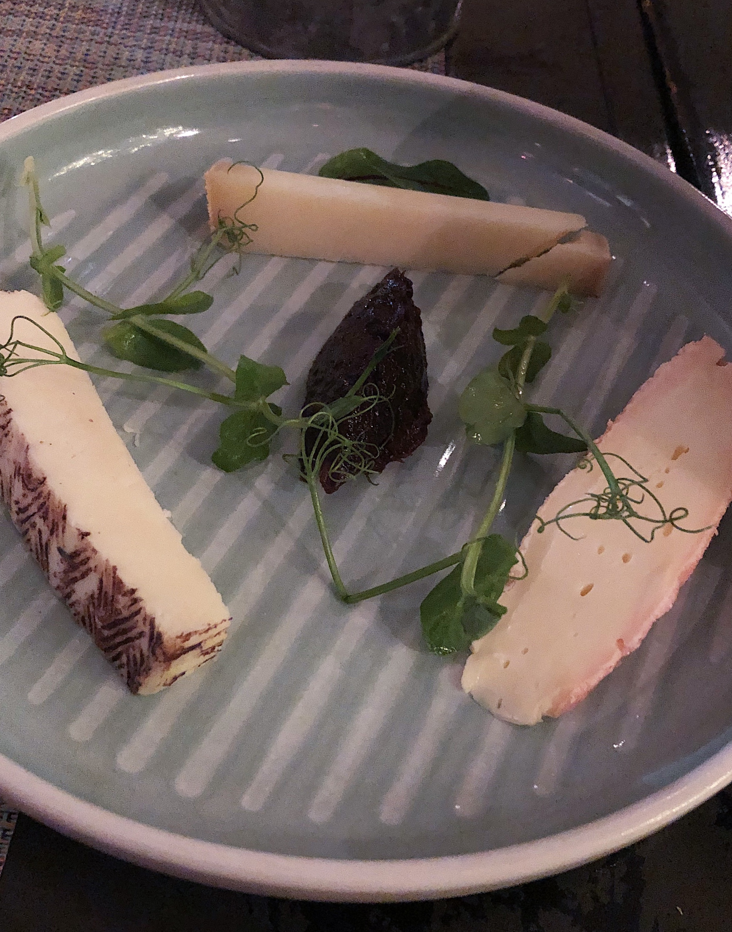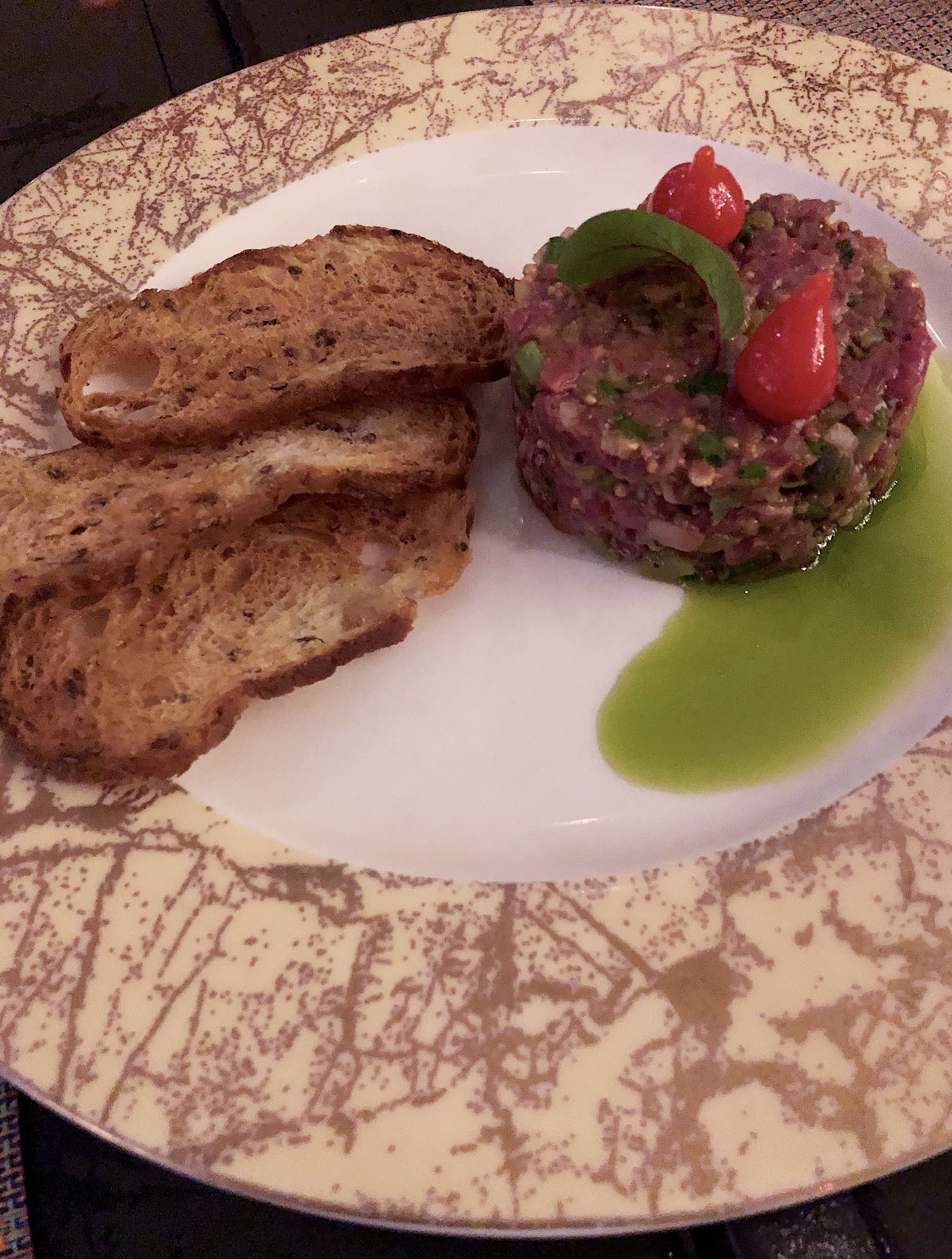 Following this amuse-bouche, a small plate of beef tartare (Tartare de Boeuf) with crostinis and an appetizer sized cheese board were delivered to the table alongside a chilled red wine. The chunks of beef were marinated in dijon mustard and mixed with capers, it was exquisitely balanced in flavour, so much so that a second order of tartare was made for dessert. The cheeseboard (Assiette de Fromage – Petite) has a revolving roster of three, and on this particular evening the stars were Munster, Abondance, and Queso Iberico(Manchego). Although all three cheeses were adored, the soft Abondance was the favourite.