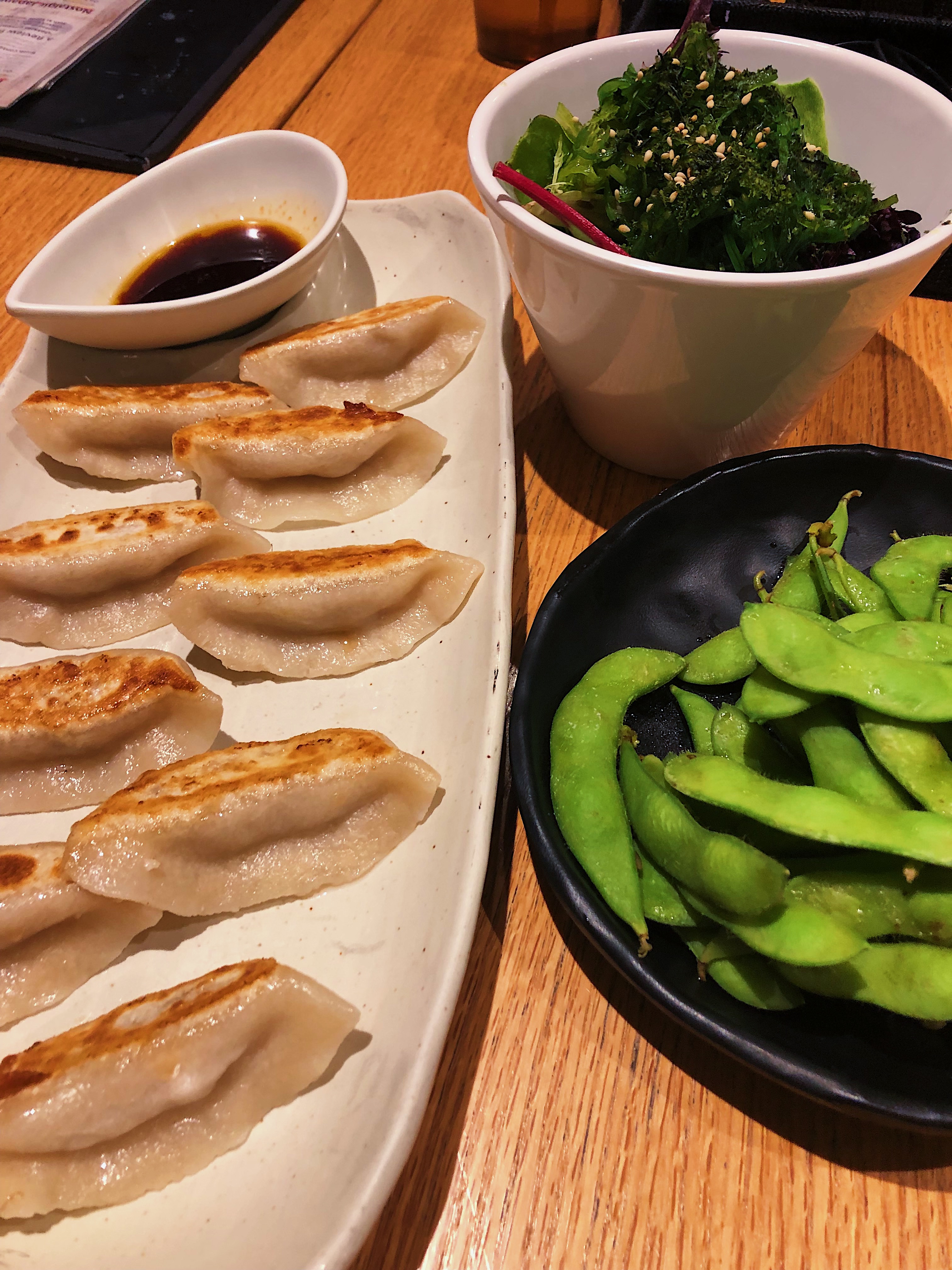 We took our time going through the ramen choices while nibbling on Pork Gyozas (Japanese dumplings), Seaweed Salad, and Edamame beans. When there’s a seaweed salad on the menu, it’s usually a go.