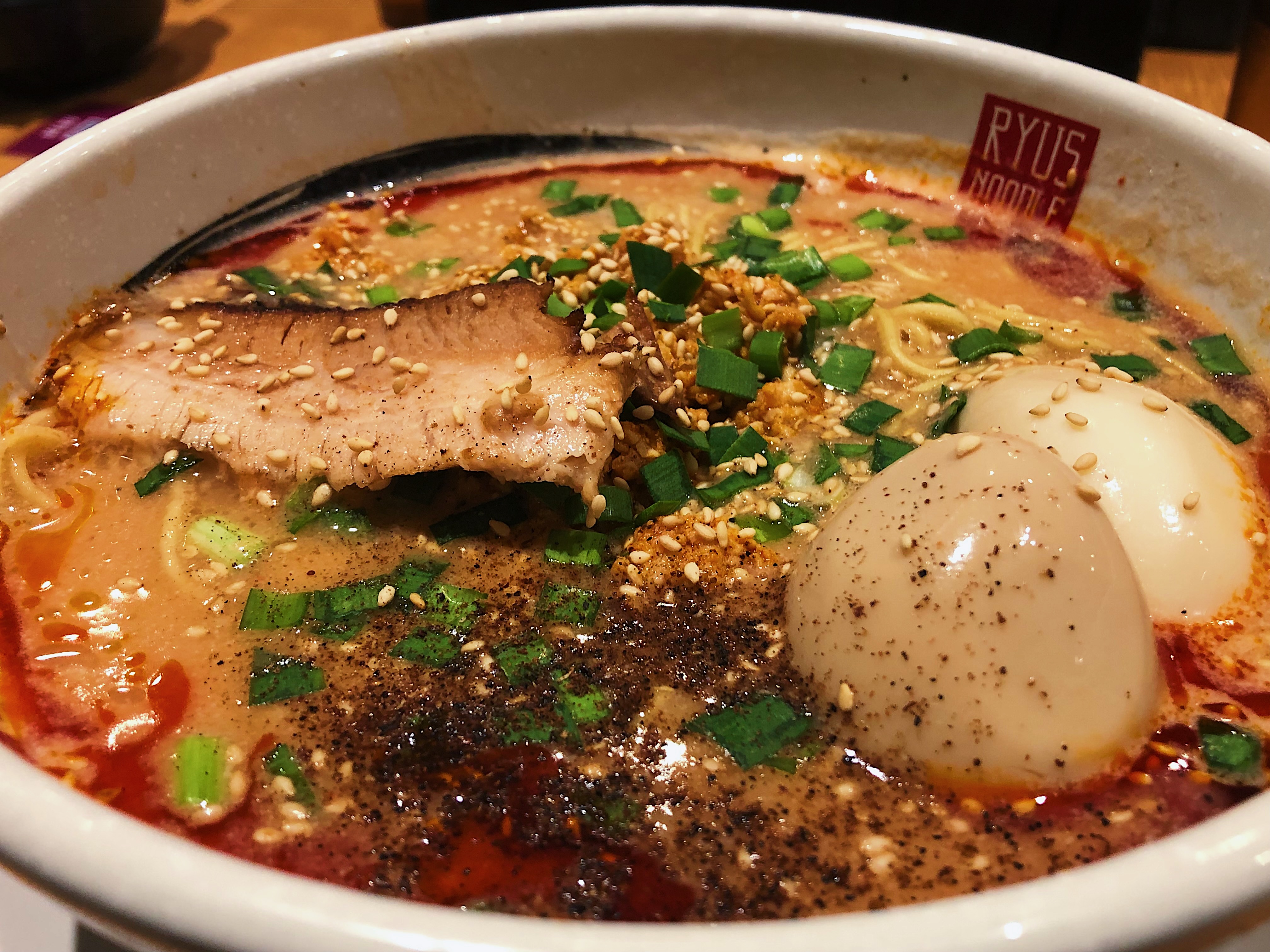 The Tan Tan Men soup claims to have Ryus’ original spice in it from the prominent chili oil made in-house. This ramen is much thicker than the first from the ground chicken inside it. The rest of the ingredients are made up of shrimp powder, chives, sesame seeds, and thin noodles. For those who like a seasoned hard-boiled egg in their ramen, that’s an add-on option to consider.