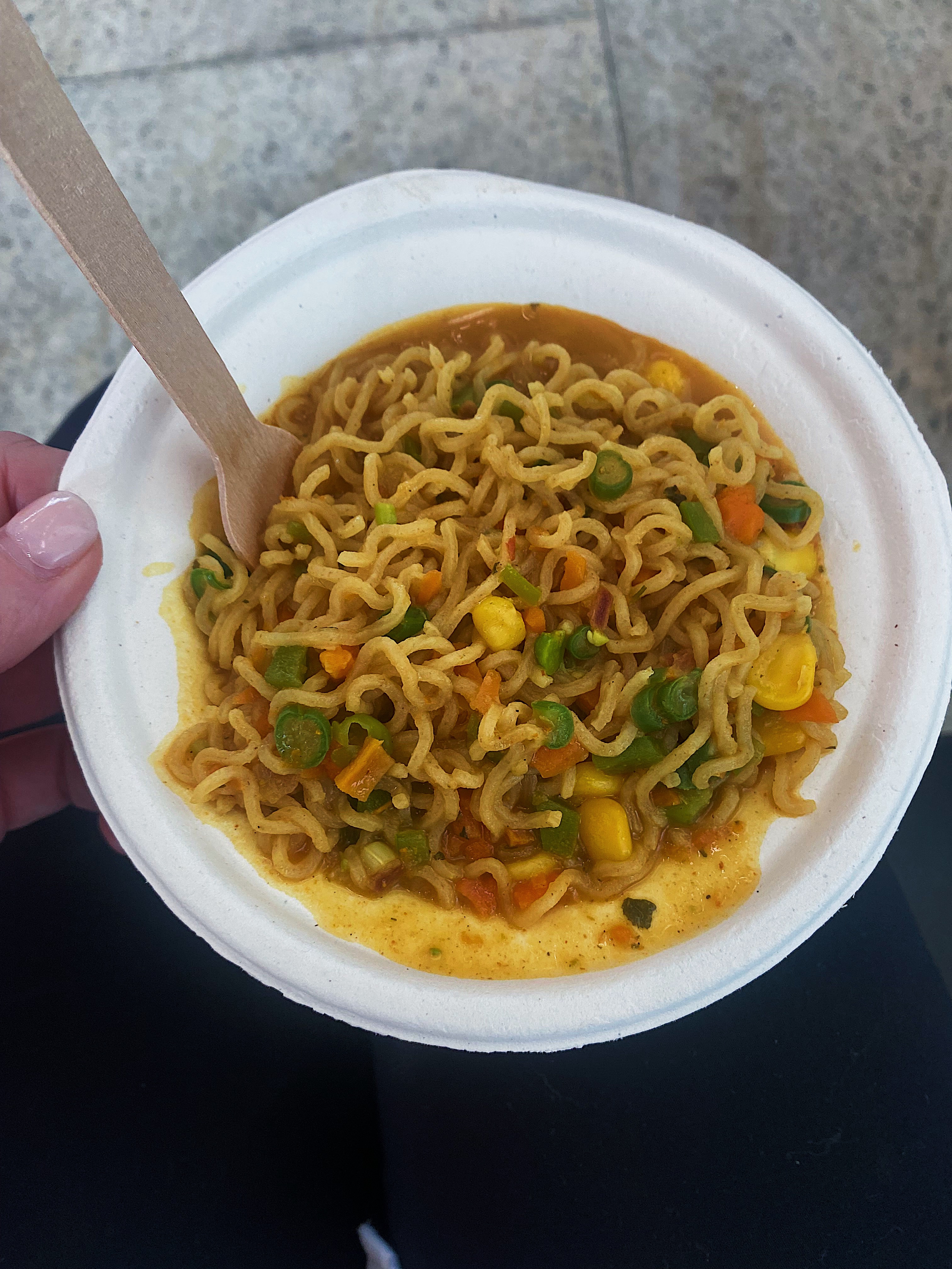These are essentially instant Asian noodles cooked with Indian spices in a wok. The bare-bones version is the noodles with spices, but you can add vegetables, eggs, or meat if you want it to be heavier. The seasoning with the spices is what makes this dish addicting.