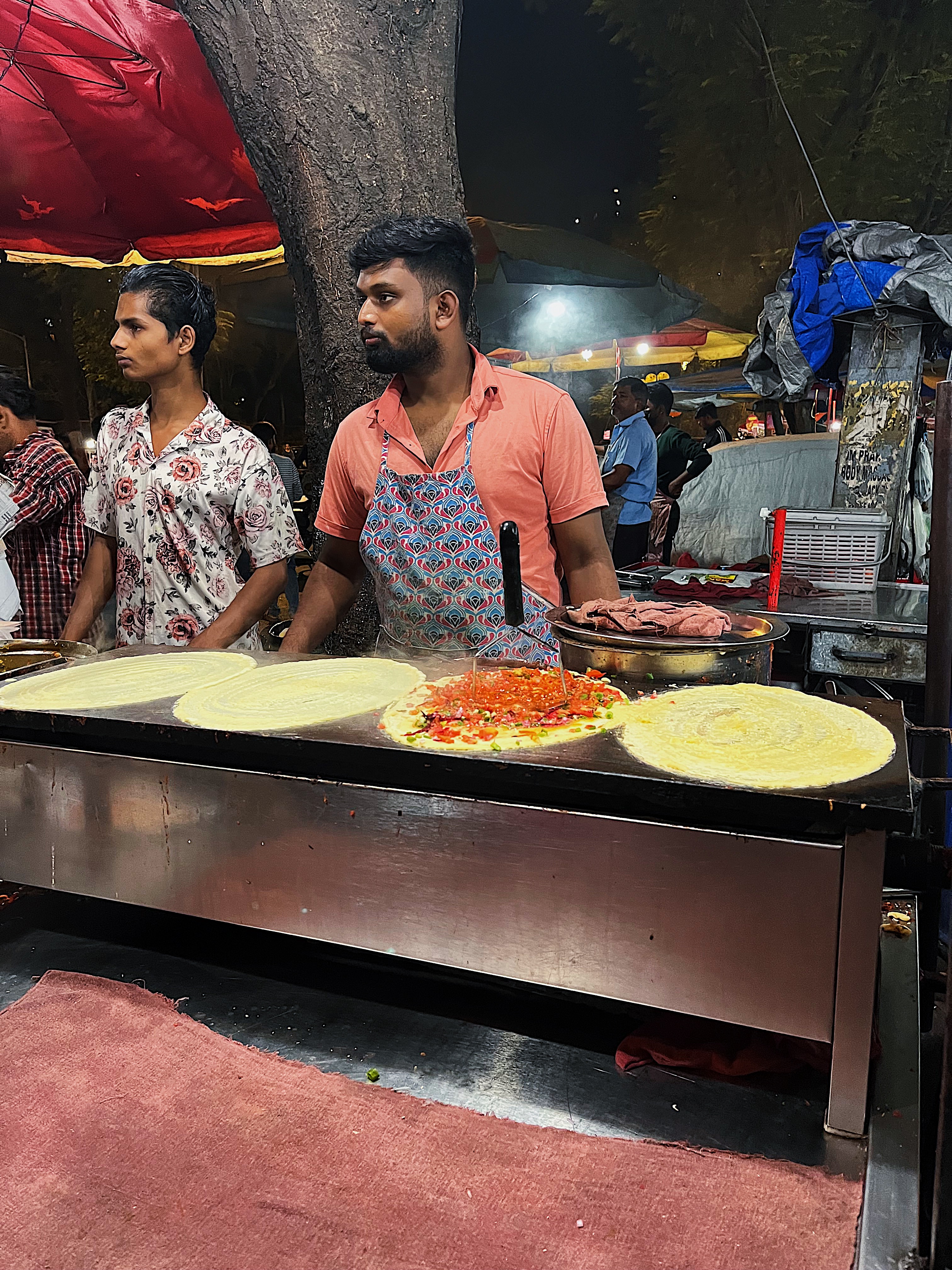 Hailing from the state of Kerala, a dosa is a big fried crepe stuffed with a curried potato mix. It’s filling, and usually doesn’t cost much, so it’s a good bang for your buck if you’ve got the appetite. Since they’re so large, it’s one of the more difficult street foods to eat without making a mess, but it’s worth every bite.
