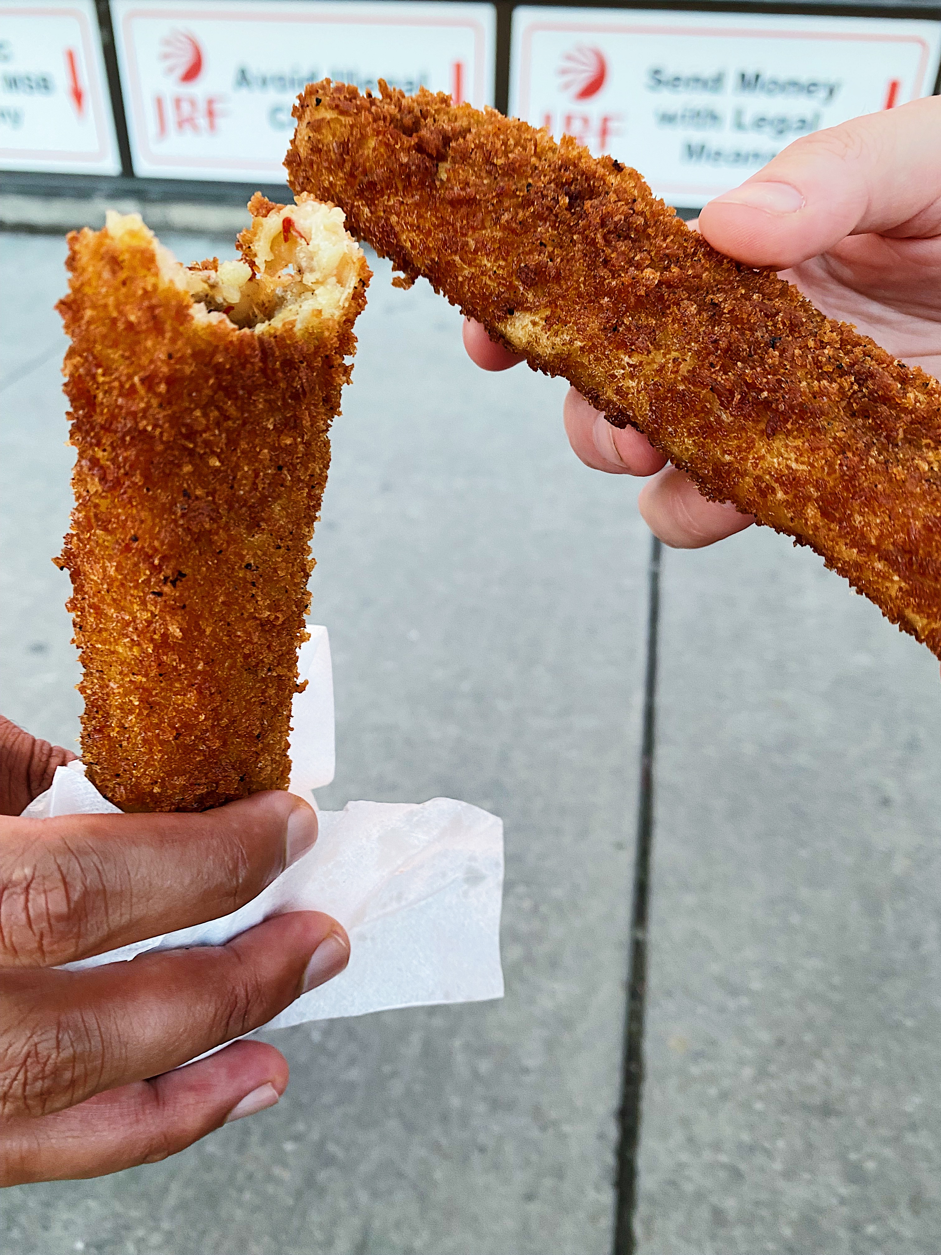 The first stop of the tour, and funnily enough also the last stop at the end of the night for dessert was at Dhaka Kebab. Although there are curries and heavier dishes available, we kicked off the night with savoury pastries and sweet tea on one of the picnic tables in the front. This was our first experience trying an Aloo Chop, a snack made from potatoes, spices, and coating then deep-fried. The blend of spices became familiar over the course of the evening, but in the first bite, it was all heavenly on the palate.