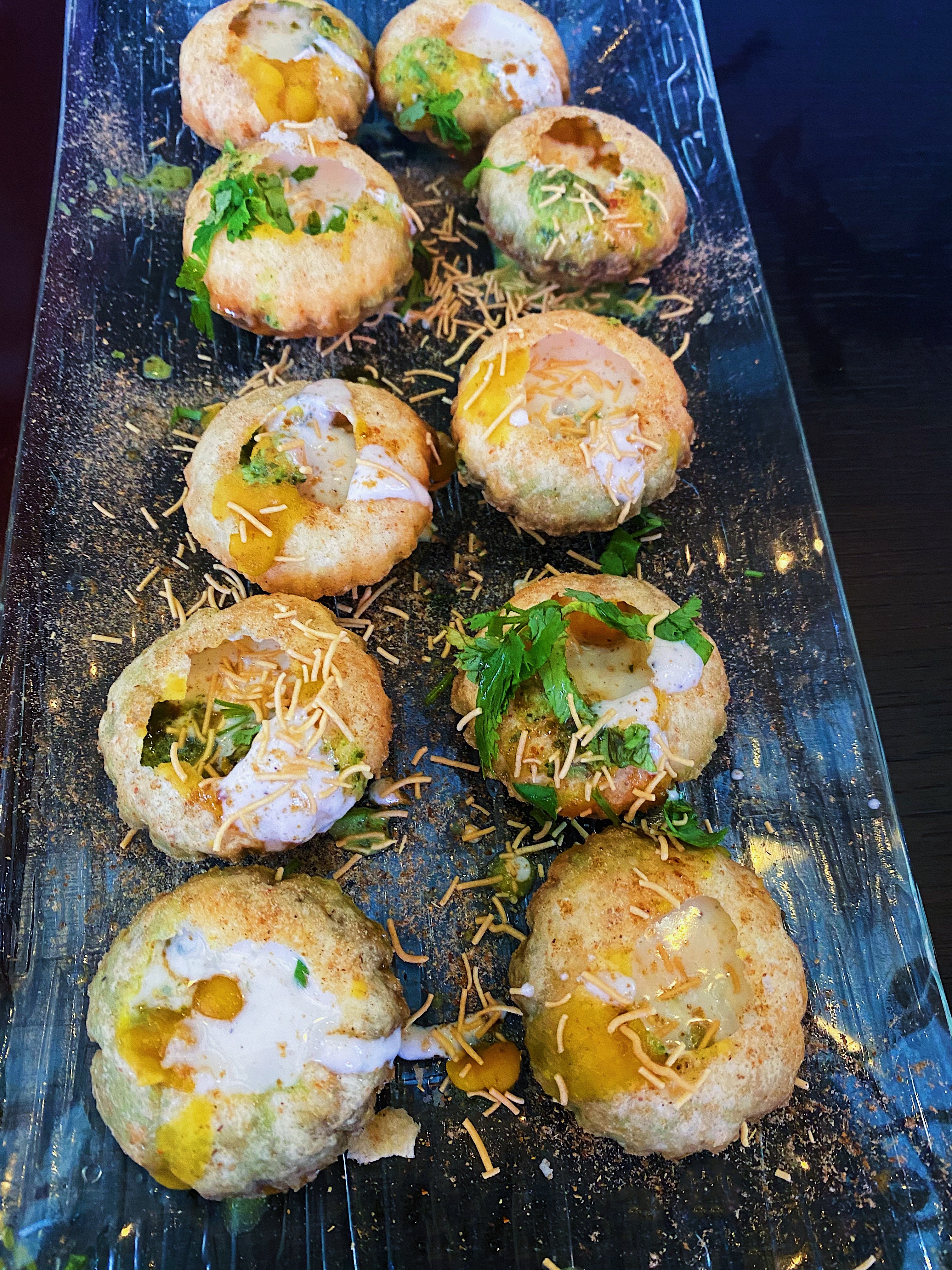 All of the ingredients and the presentation are the same as a Dahi Puri but without the yogurt, that’s replaced with a tangy spicy water sauce. The one bite approach of eating it is still recommended here.
