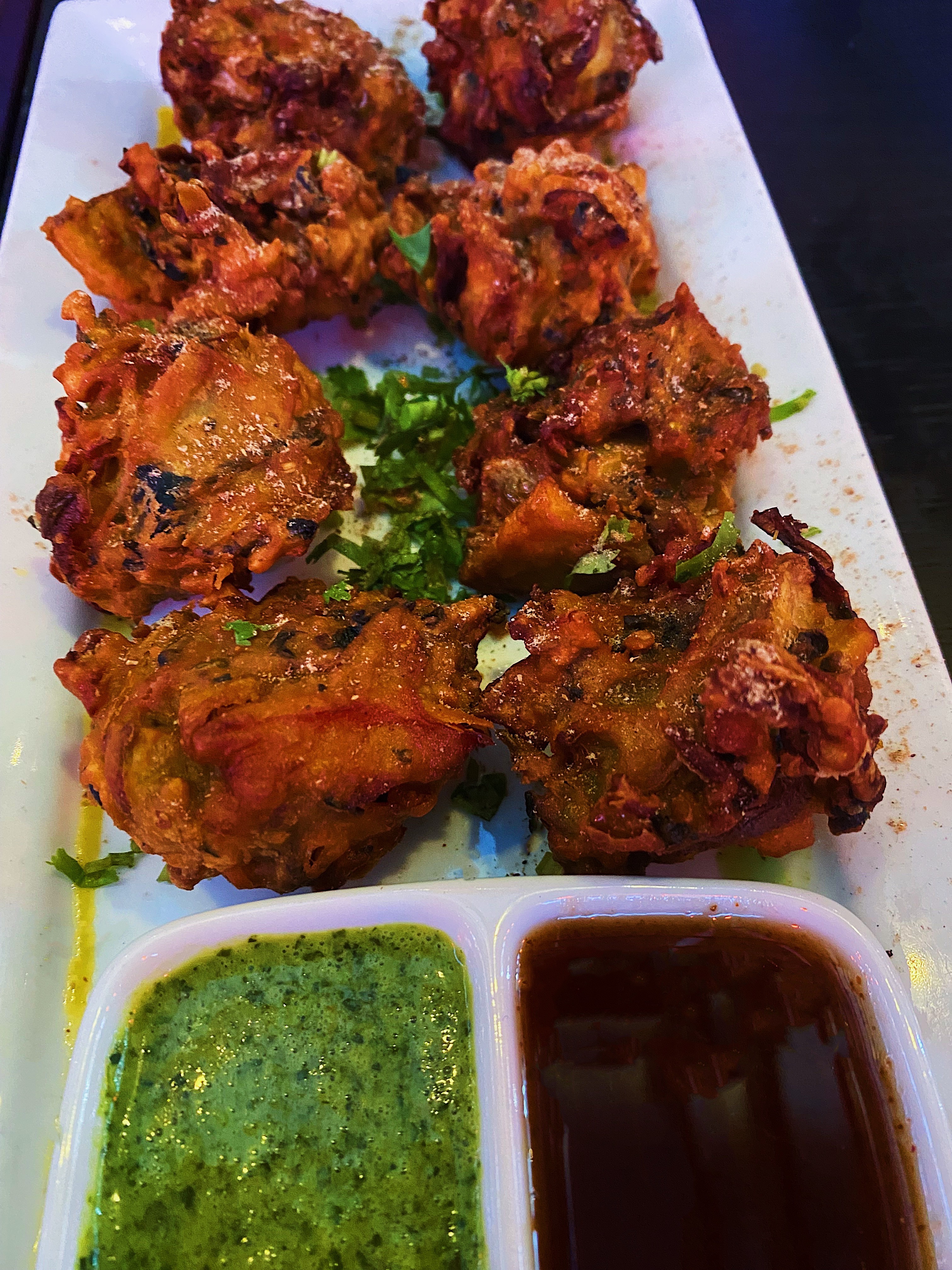 The greens made this particular pakora feel a little healthier than usual, but not by much! A Pakora is a popular Indian snack made with potatoes, onions, flour, and spices then deep-fried. It’s delicious on its own or dipped in chutneys.