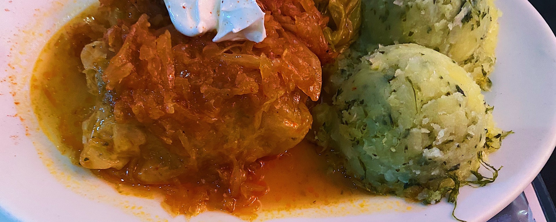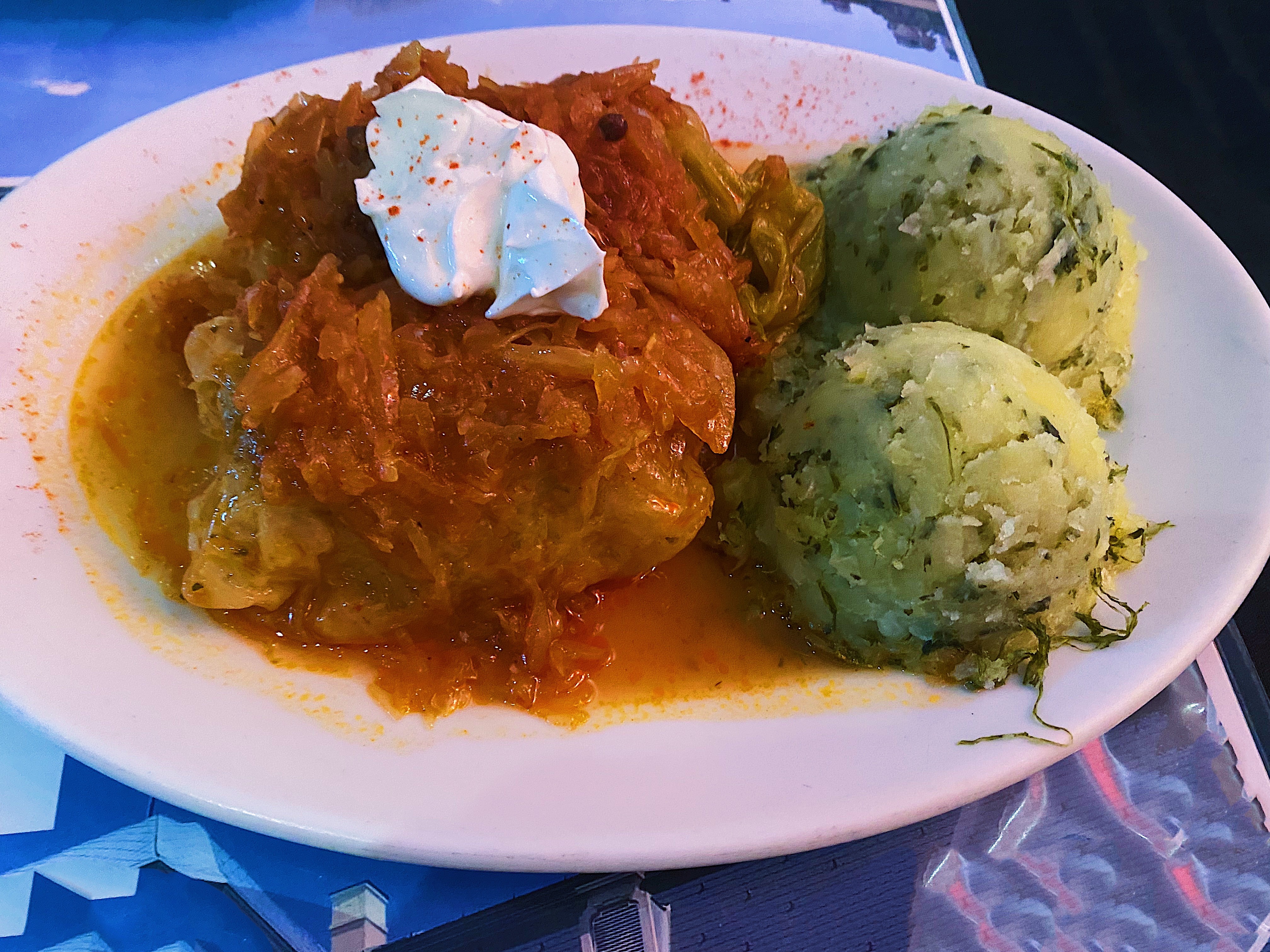 The next dish that arrived was the Hortobágyi Style Crepe, which identifies itself as a sauteed crepe stuffed with slow cooked meat and then topped with a traditional gravy and sour cream. If you’re only going to order one thing, it would be this sauce on everything. Not surprisingly, there’s an obvious paprika presence with chicken stock and soup cream that gives it a velvety texture.