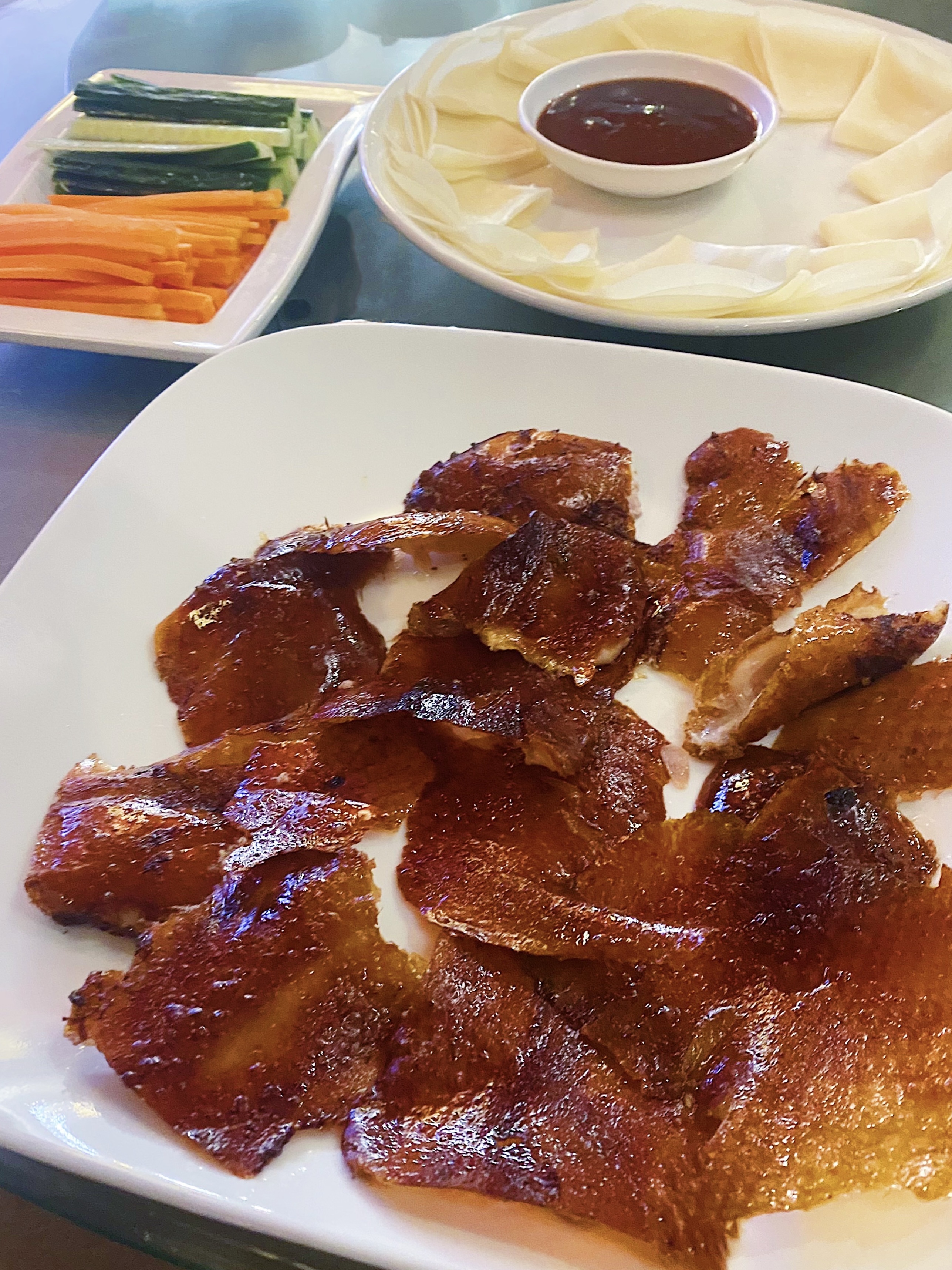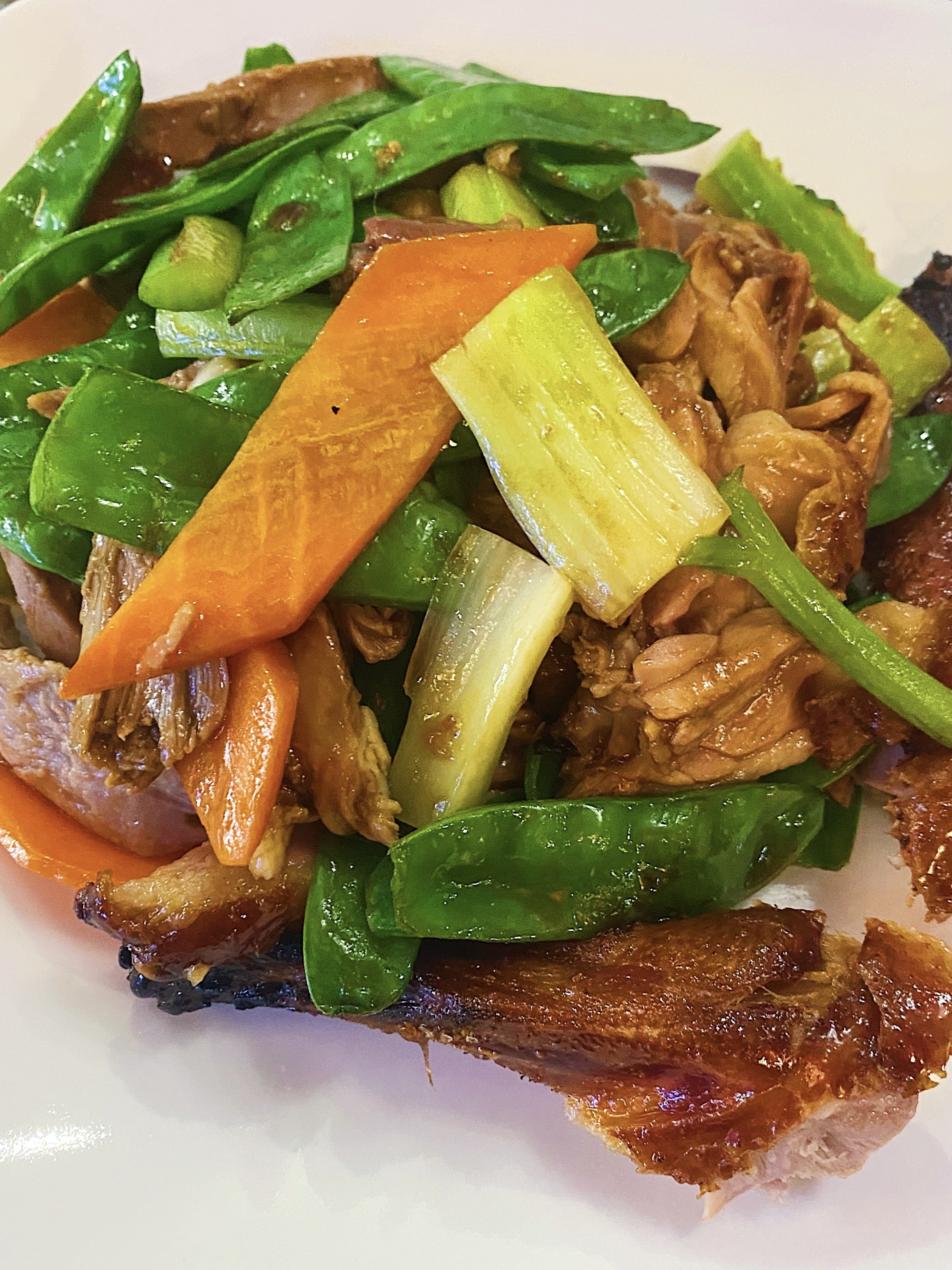 Wok and Roast is one of two places in East-end Chinatown that decorates its front windows with cooked ducks and other meats ready to be enjoyed in both half and full portions. Once ordered, the duck is coursed out. The first course serves the crispy skin that you add to a small wrap and add carrot, cucumber and hoisin. It’s similar to a taco. The crispier the skin, the better. The second course arrives shortly after, and it’s a plate with a mountain of juicy pieces of duck meat served with sautéed carrot, peas and celery. You want to do both courses to be able to taste the different parts of the bird.