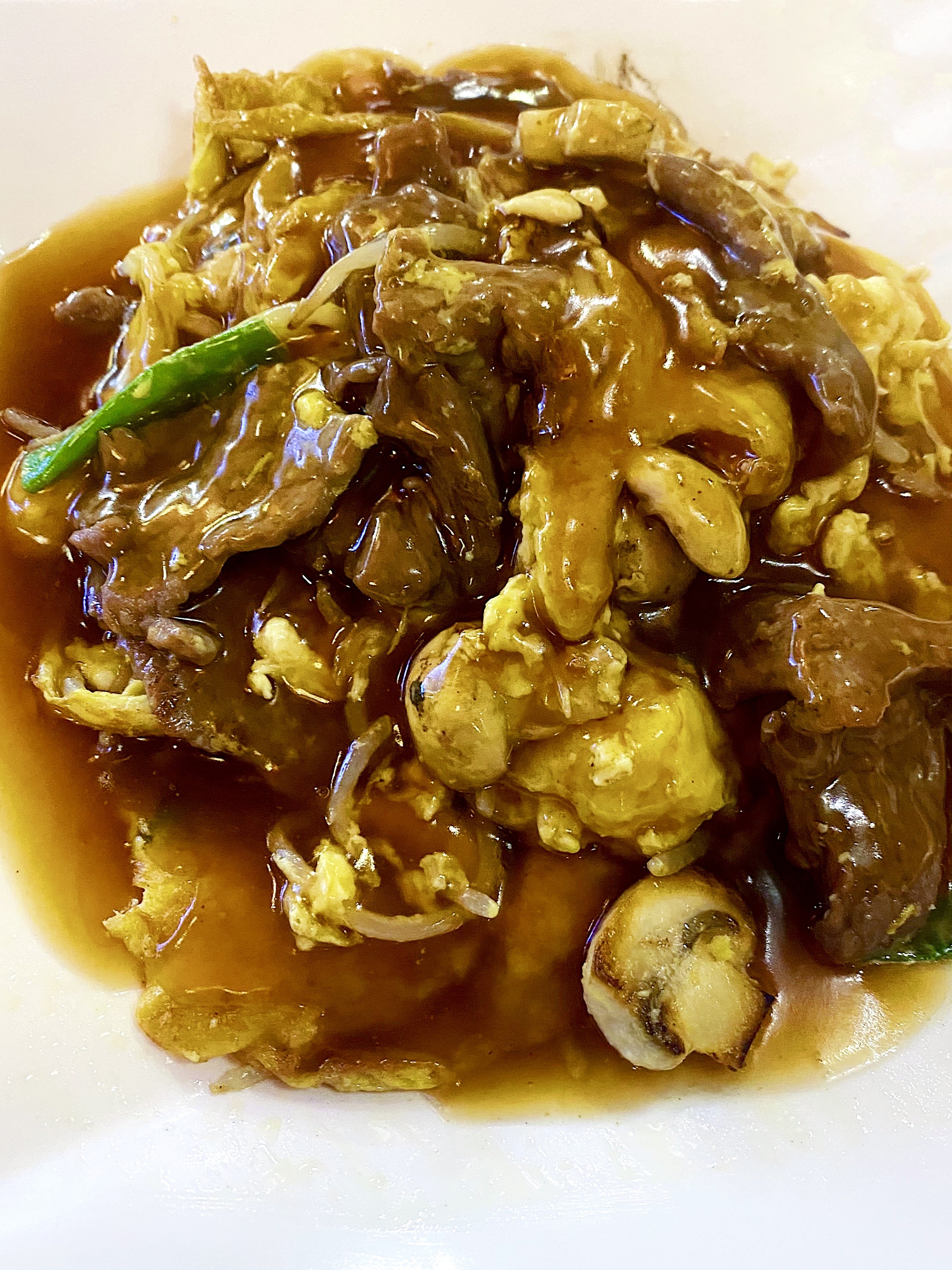 Our server recommended the Beef Egg Foo Yong to diversify our picks. It’s an omelet topped with grilled pieces of sliced beef and mushrooms and topped with a gravy. It’s more dense than some of the other dishes that we ordered since the majority of it is protein.