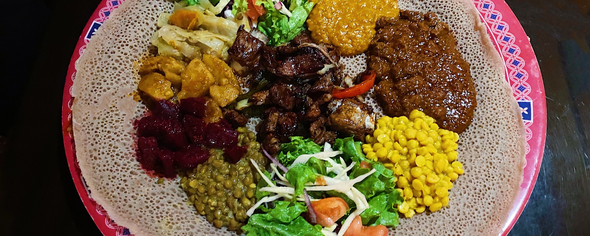 A group of six people meant that we needed a lot of variety in dishes to sample, and we would have a lot of injera. The main event was the Special Meat and Vege Platter with Chacha Tibs added to it (#16 with #13 on the menu). The large piece of injera covers the entire platter and then all the meats and vegetables take up small sections to themselves all over it. It’s a quilt of edible flavours and textures. This is what you start the order with and then expand from there.