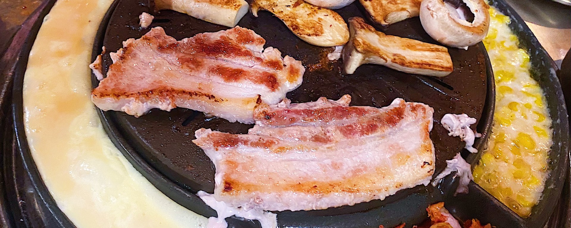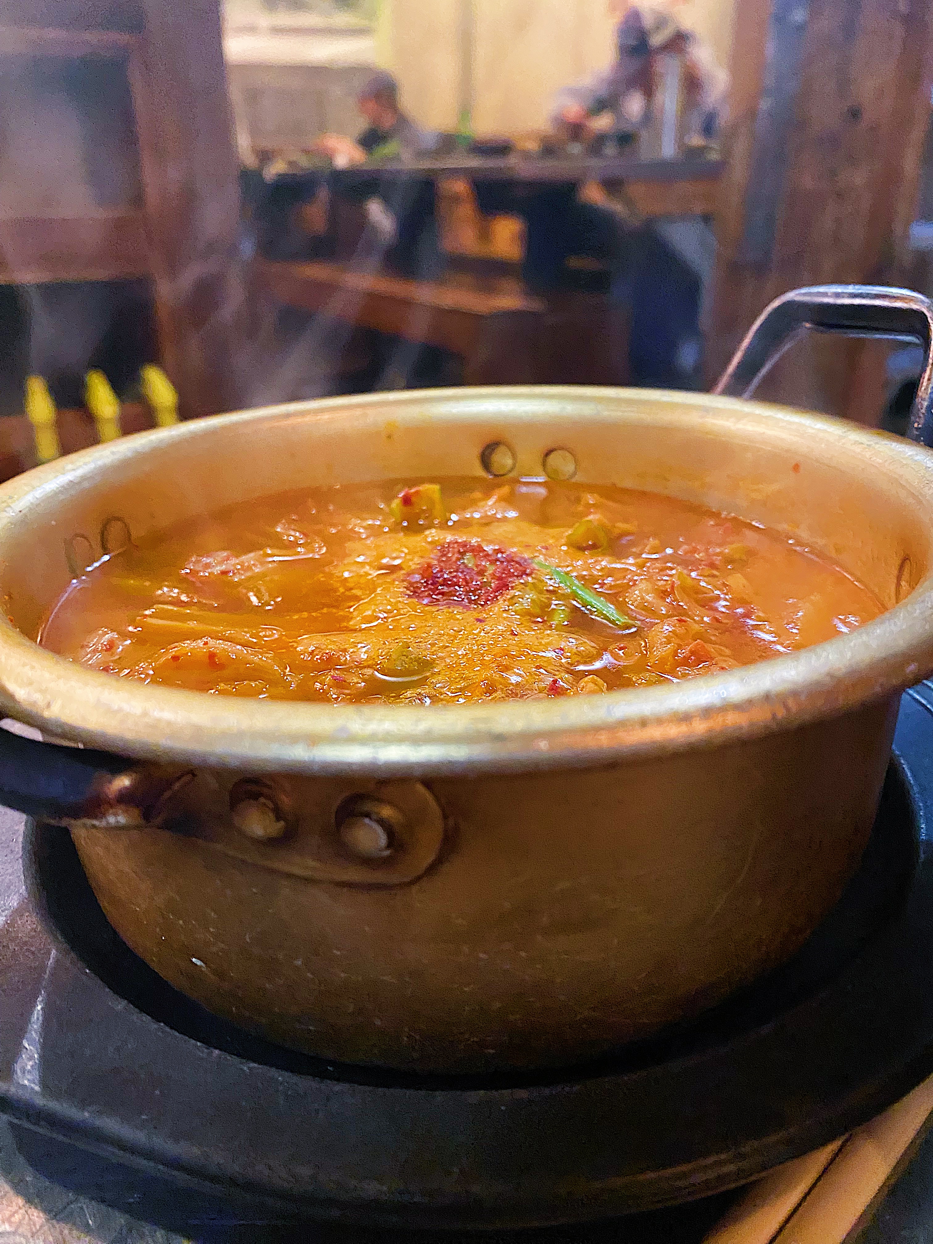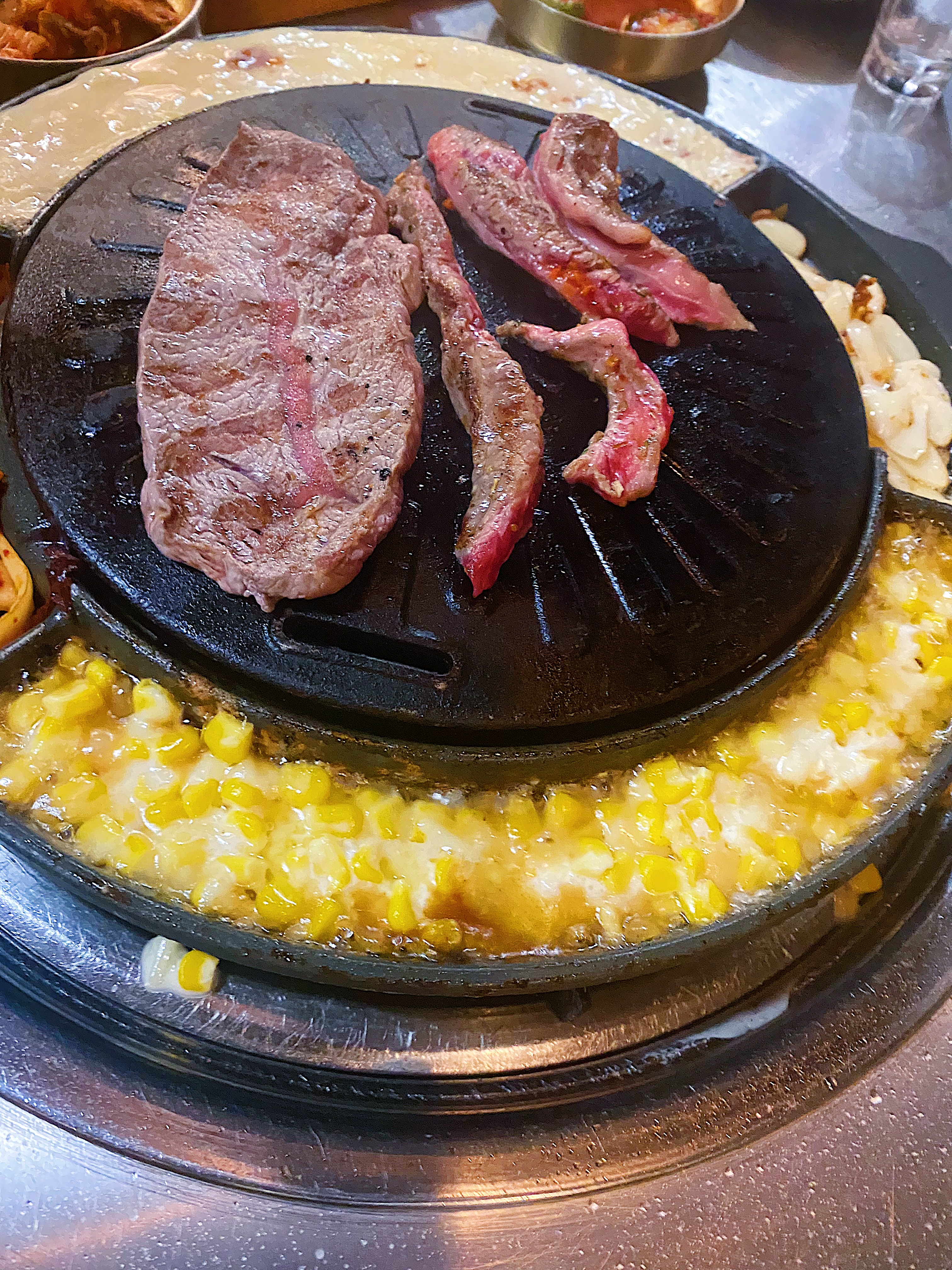 All the tables are equipped with a small burner in the middle for grilling raw meats and vegetables, and as it heats up, the raw egg, garlic, kimchi, and corn cheese are cooked alongside it to snack on throughout the meal.