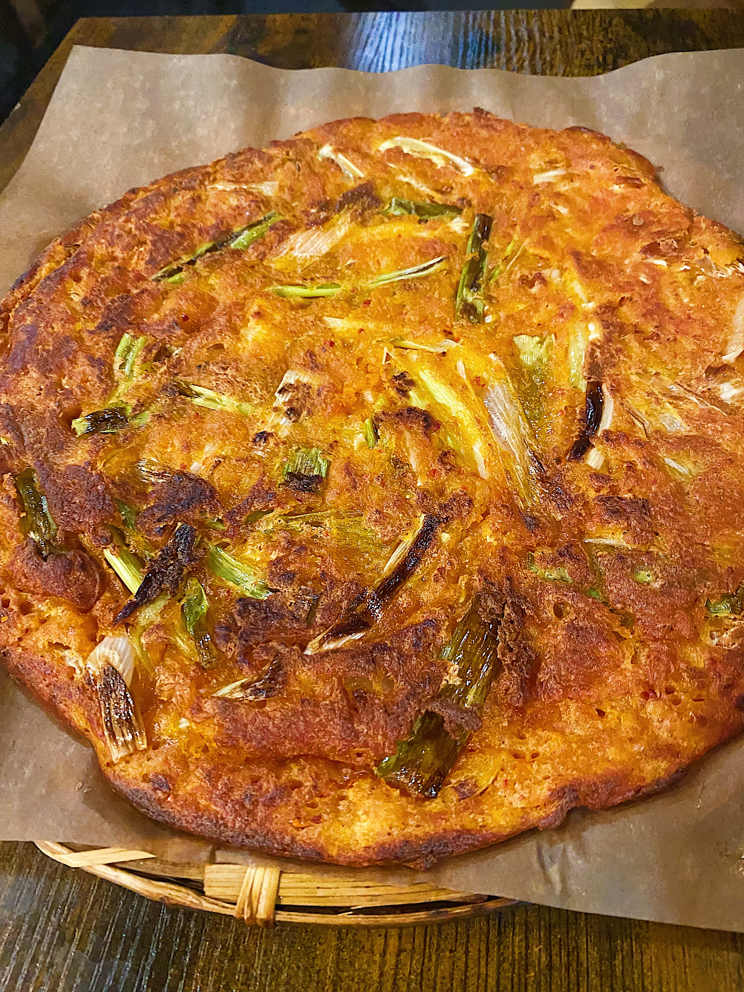 It’s not a Korean feast without a round of Kimchi Pancake. It’s a savoury number made with a kimchi and green onion batter, then fried into a pancake shape. There’s a peanut and a chili sauce to dress it up a bit.