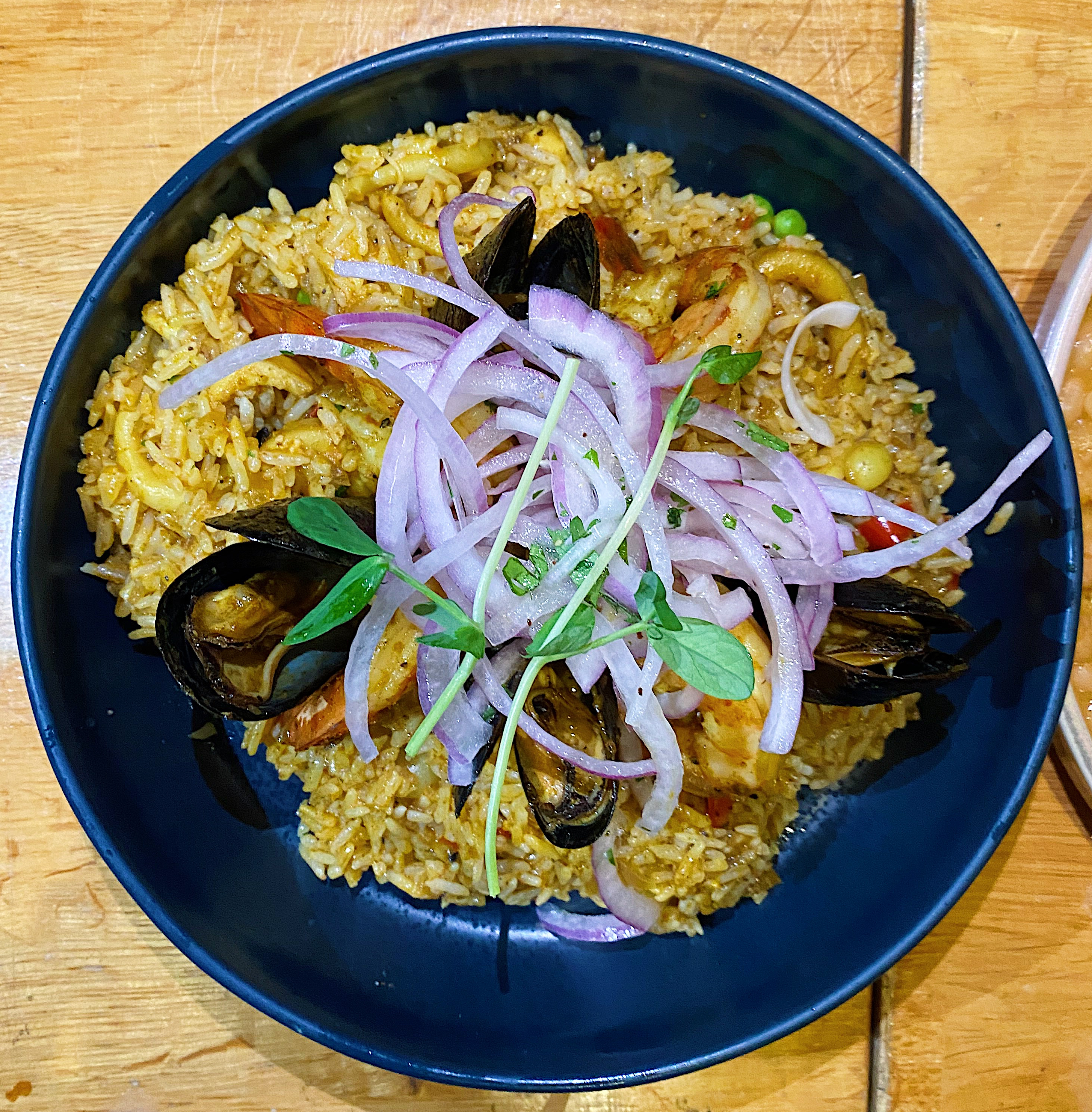 Our crowd pleaser of the evening was the Arroz Con Mariscos, which is a Peruvian-style paella hiding fish and seafood throughout. This spicy rice is cooked with shrimp, calamari, octopus, mussels, chilies, peas, and corn. Despite having the other ingredients, the main event is the generous amounts of seafood within the rice, it’s impossible to get a bite without something from the sea. This dish is packed with flavour, and seafood, obviously.