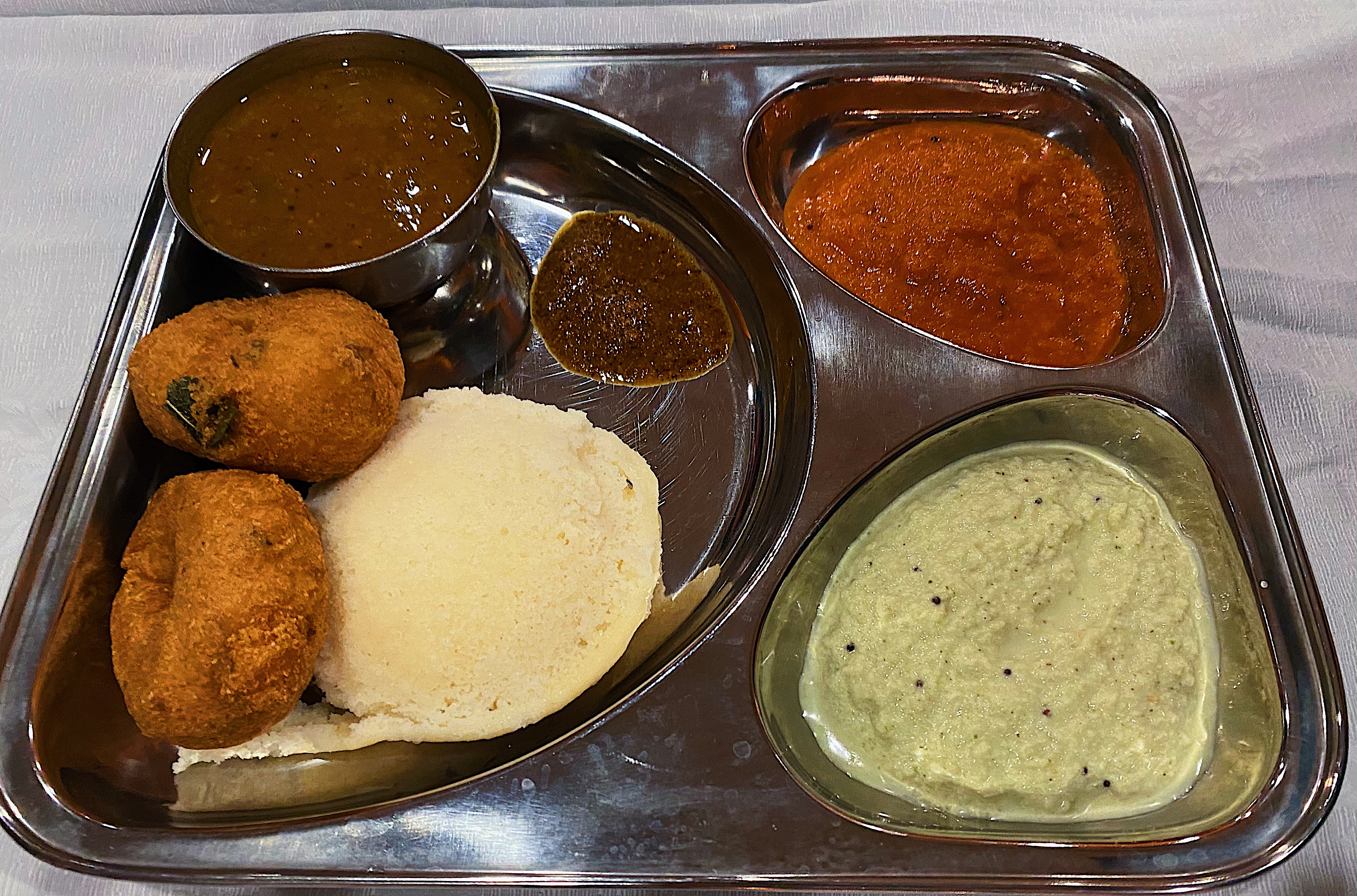 - Idli Vada Combo: This is a classic pre-meal bite served with a flavourful stew called Sambar and a coconut dip. Idlis are puck-shaped fermented rice cakes that are soft when you bite into them and absorb liquid impeccably well. It’s paired with a fried donut shaped vada that’s a little harder and can be broken into pieces and dunked into the sambar and the chutneys. While you’re deciding on the rest of the order, snack on this!