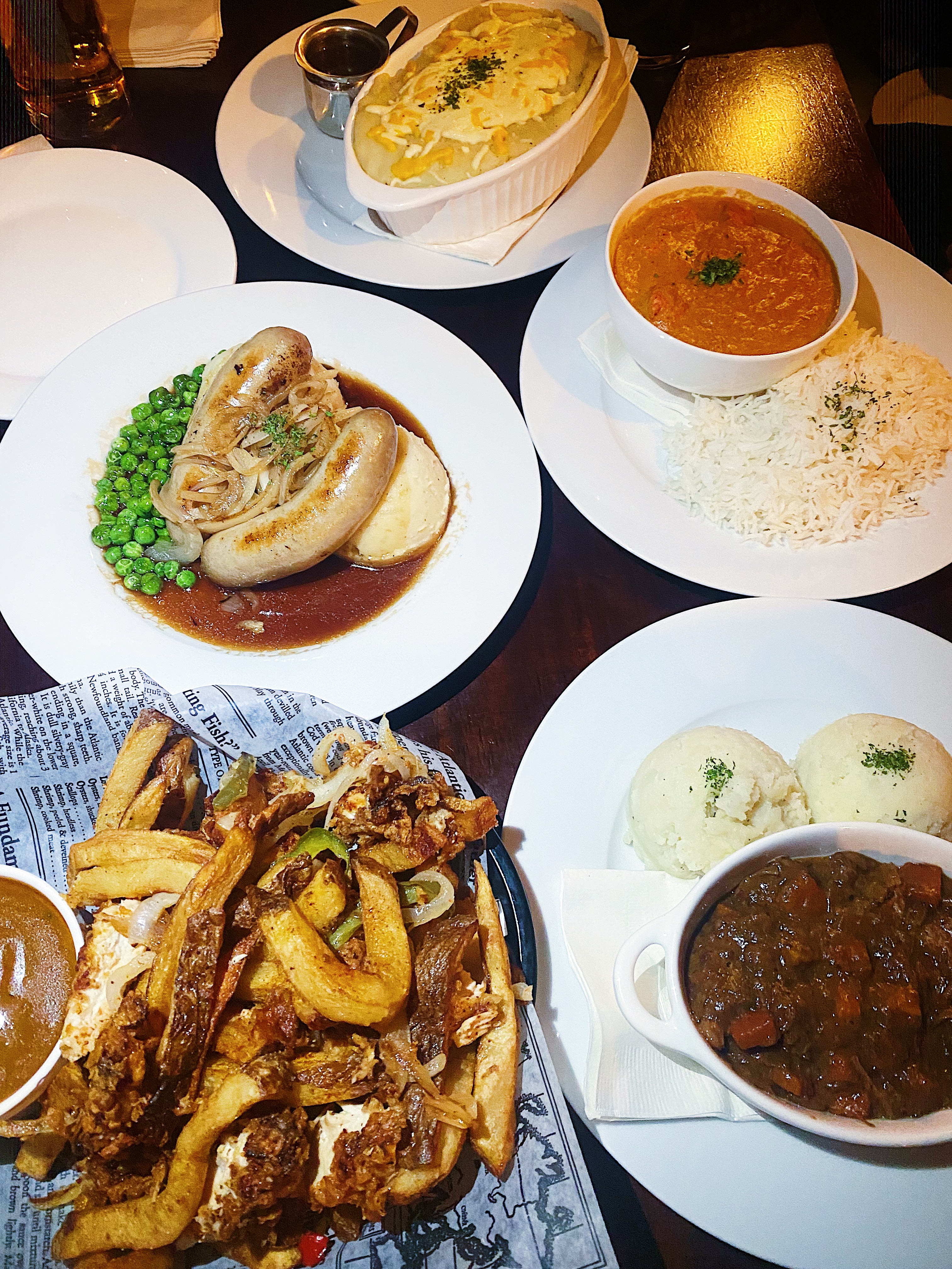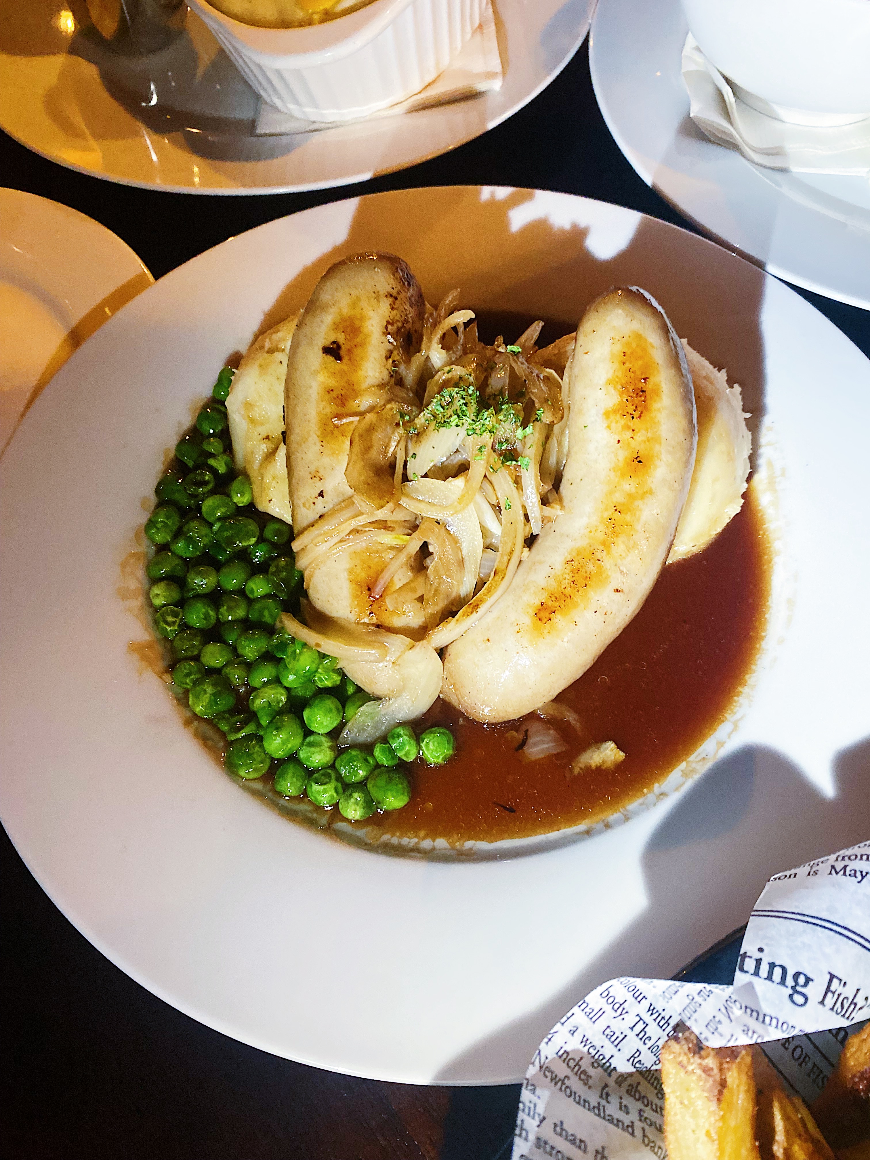 A classic for a reason. Sausages, mashed potatoes, mushy peas, sautéed onions, and a side of gravy. Pure comfort food that feels like wrapping yourself in a warm blanket by the fire. No surprises here, just solid execution and satisfying flavours.