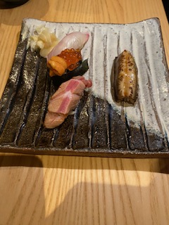 - Anago (sea eel), fatty tuna, salmon roe and sea urchin, stripe jack
