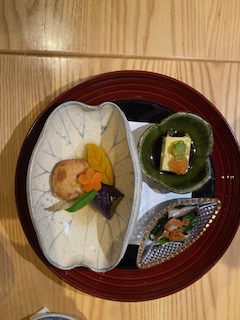 - Spinach marinated in soy sauce, egg mixed with wagyu beef and steamed , white fish and tofu fritter with seasoned vegetables