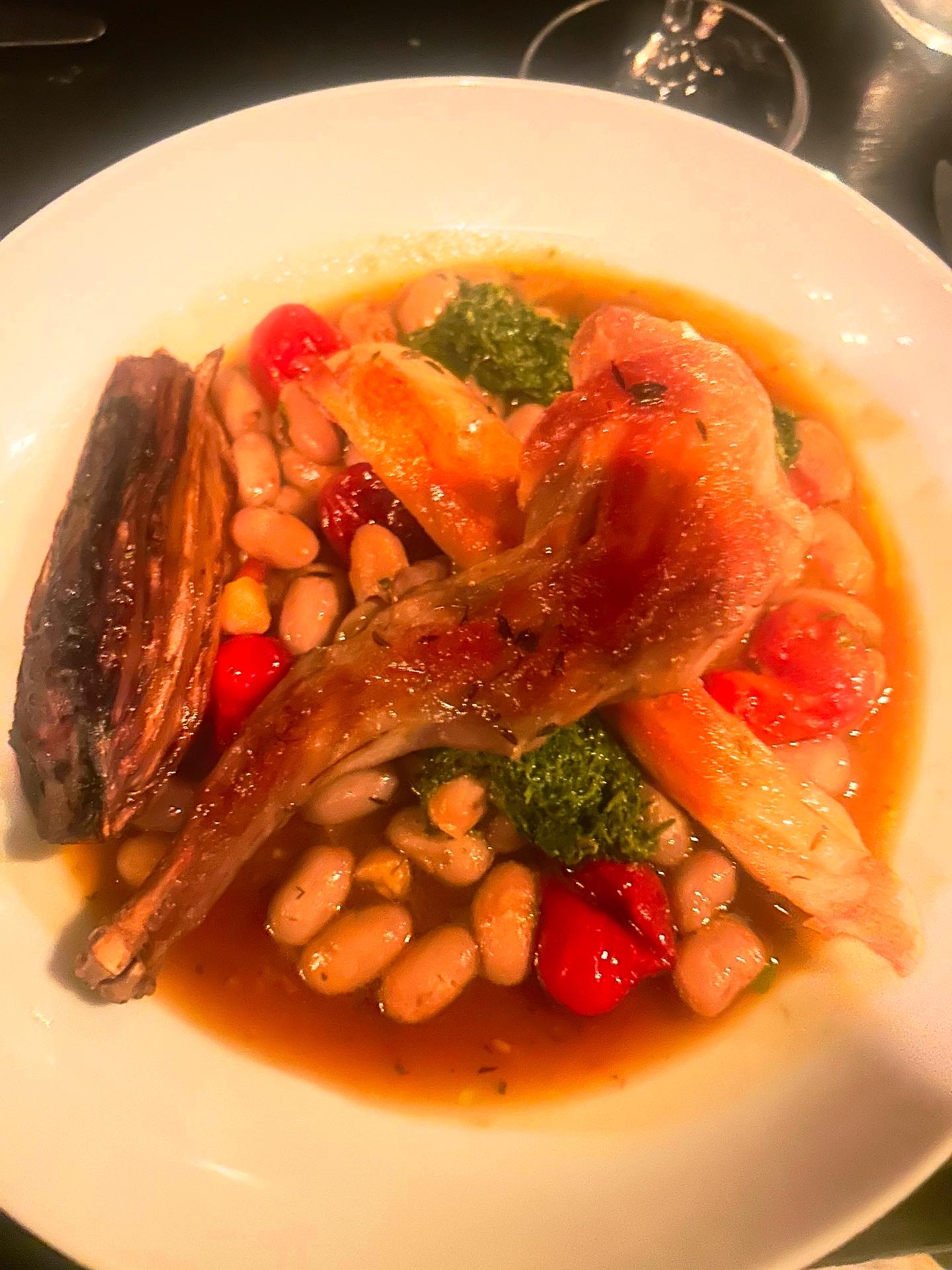 Yes, it’s rabbit, and no, it’s not weird. Think roast loin that leans more chicken than cartoon character, served with creamy white beans and a punchy salsa verde. Clean, light, and totally delicious.
