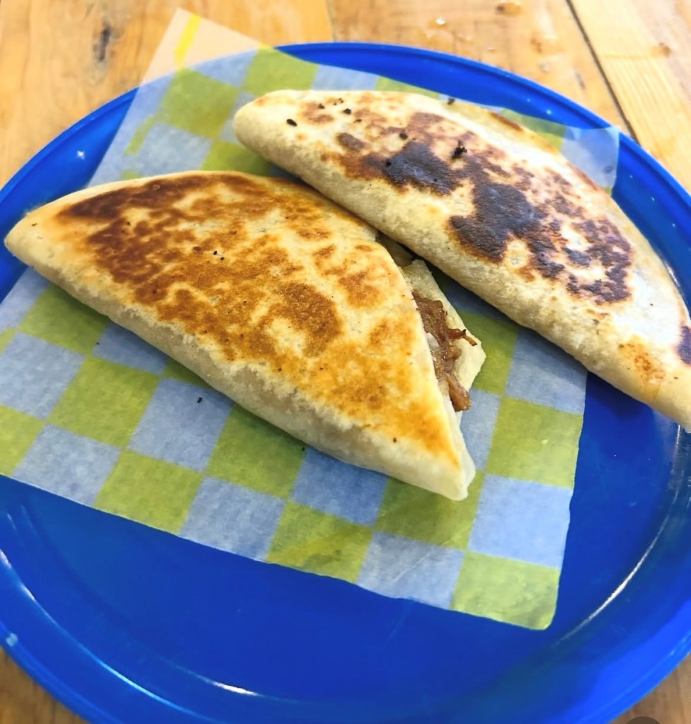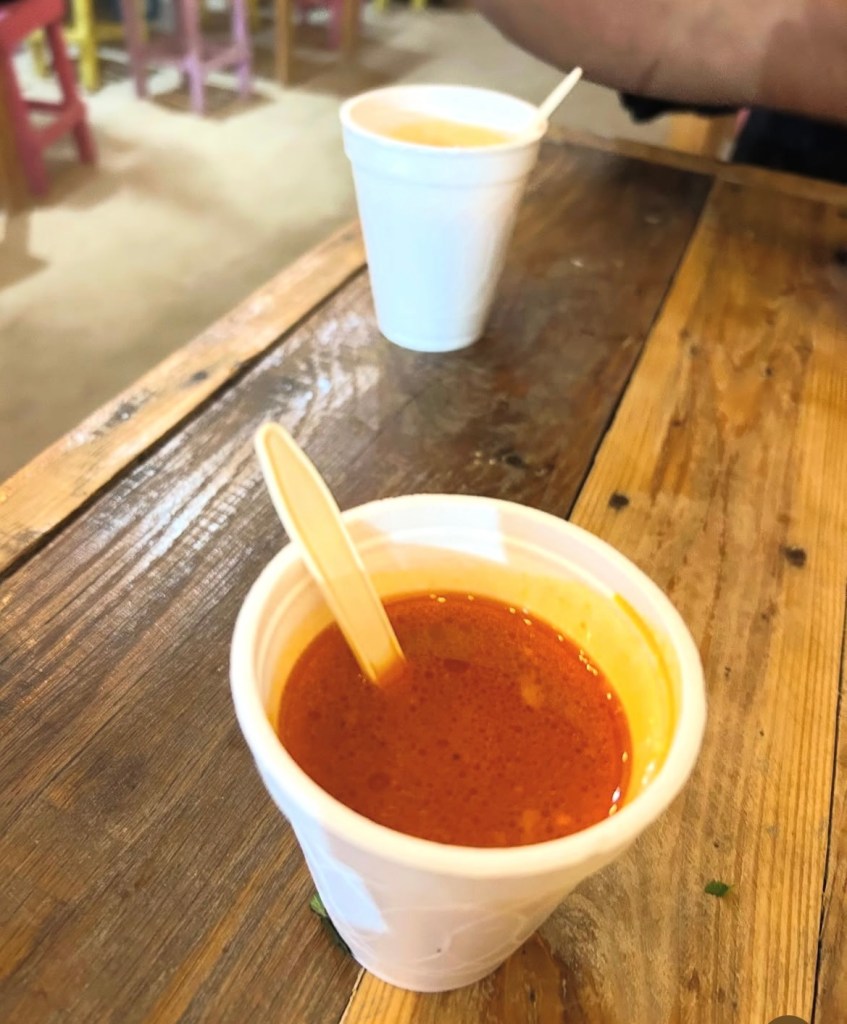 Like the first birria stand we’d tried on the island, they keep things simple: tacos, quesadillas, and consommé, but Birria La Catrina has its own soul. It’s got more of a permanent feel, a proper little restaurant with colourful papel picado hanging from the ceiling, vintage Mexican hits on the speakers, and tables packed with locals and travellers all digging into steaming plates of birria.