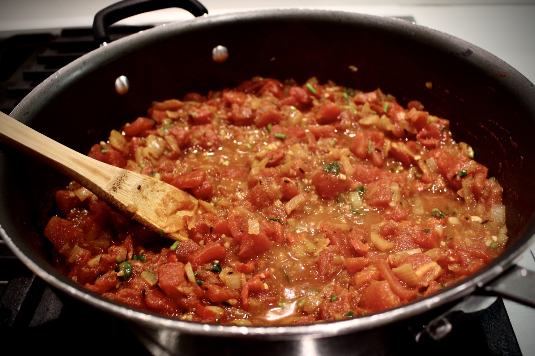 - Add the tomatoes and bring to a boil, then reduce to low heat and simmer for approximately 10 minutes.
