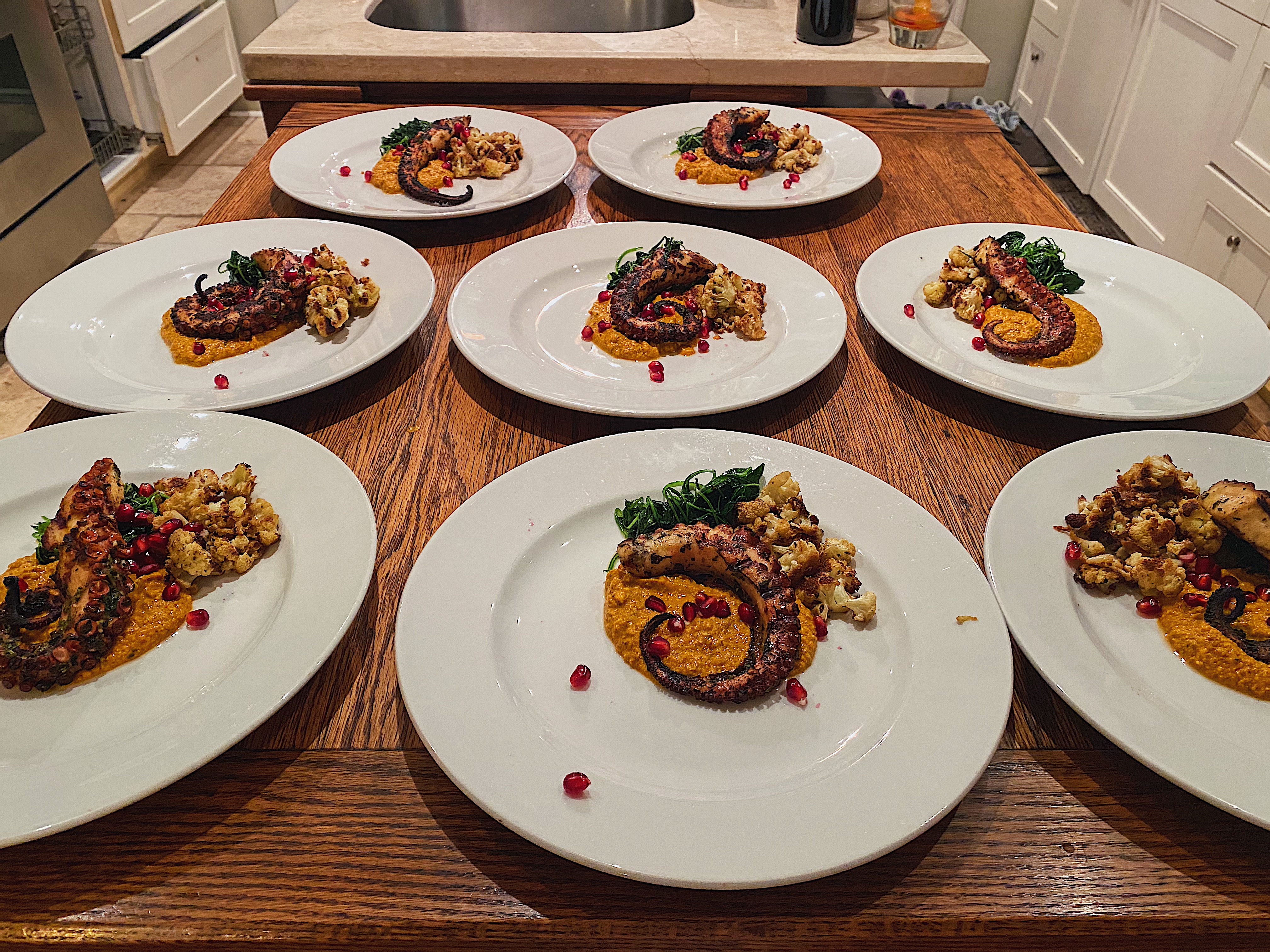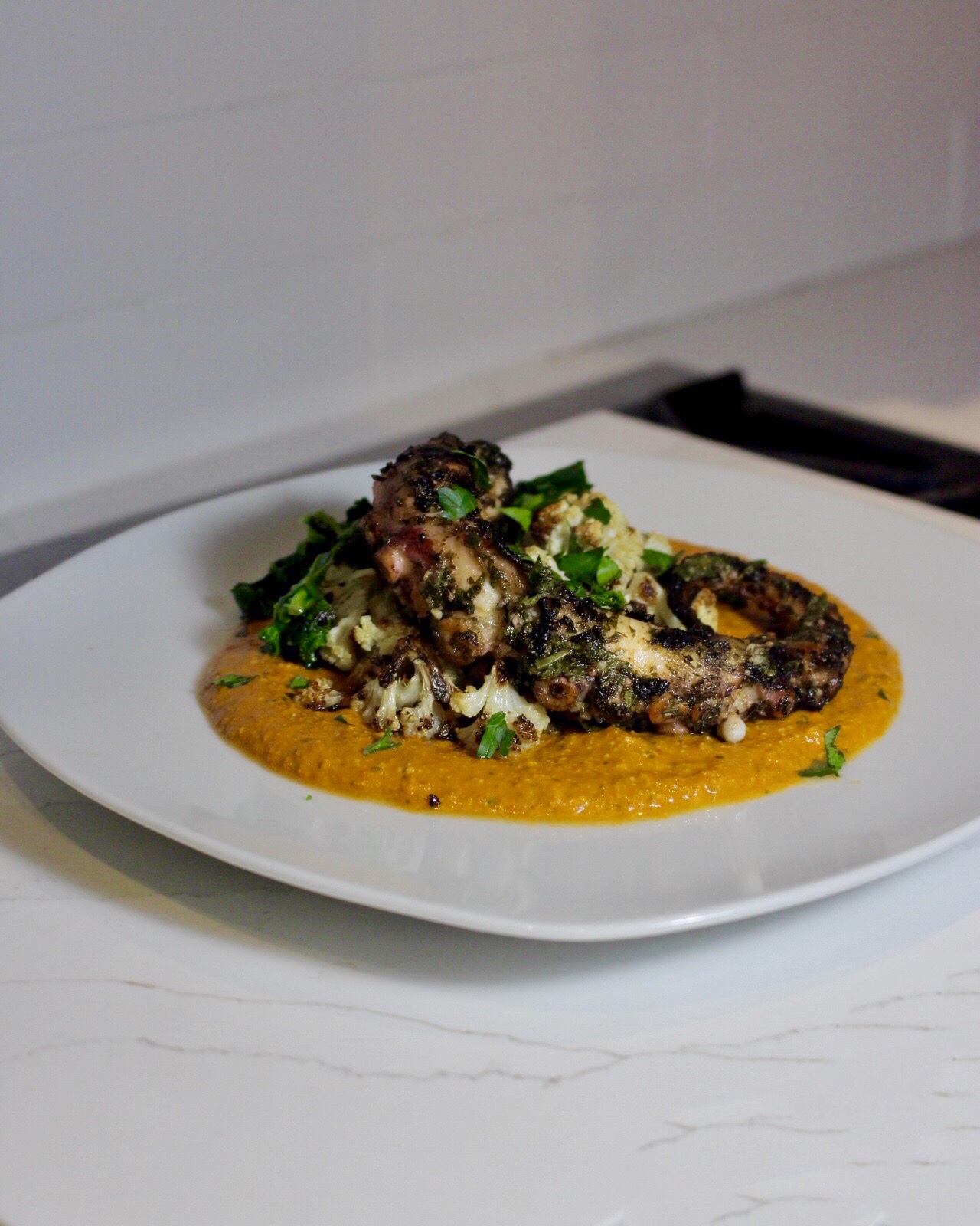 - Heat in a pan or a pot and serve a generous portion on the base of the grilled octopus.