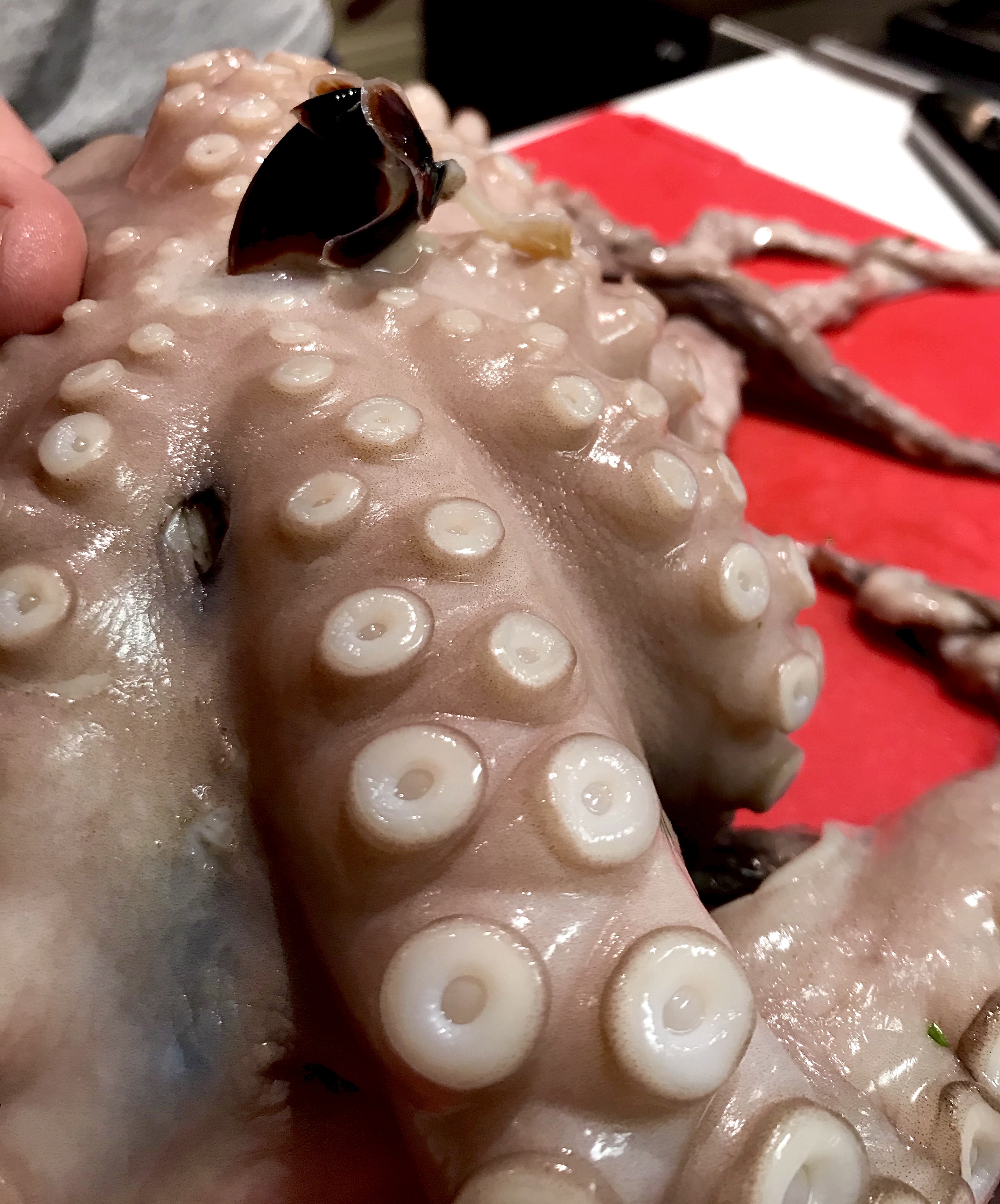 Thoroughly wash the octopus with cold water, removing any dirt or debris. Remove the head from the octopus making a cut just under the eyes. You can eat the head, but it’s not for everyone. Remove the beak from the underside, in-between the tentacles, by pushing it out. The cooking directions can be performed with individual tentacles or with all of the tentacles attached to the body. For best results while grilling, cut off the tentacles.