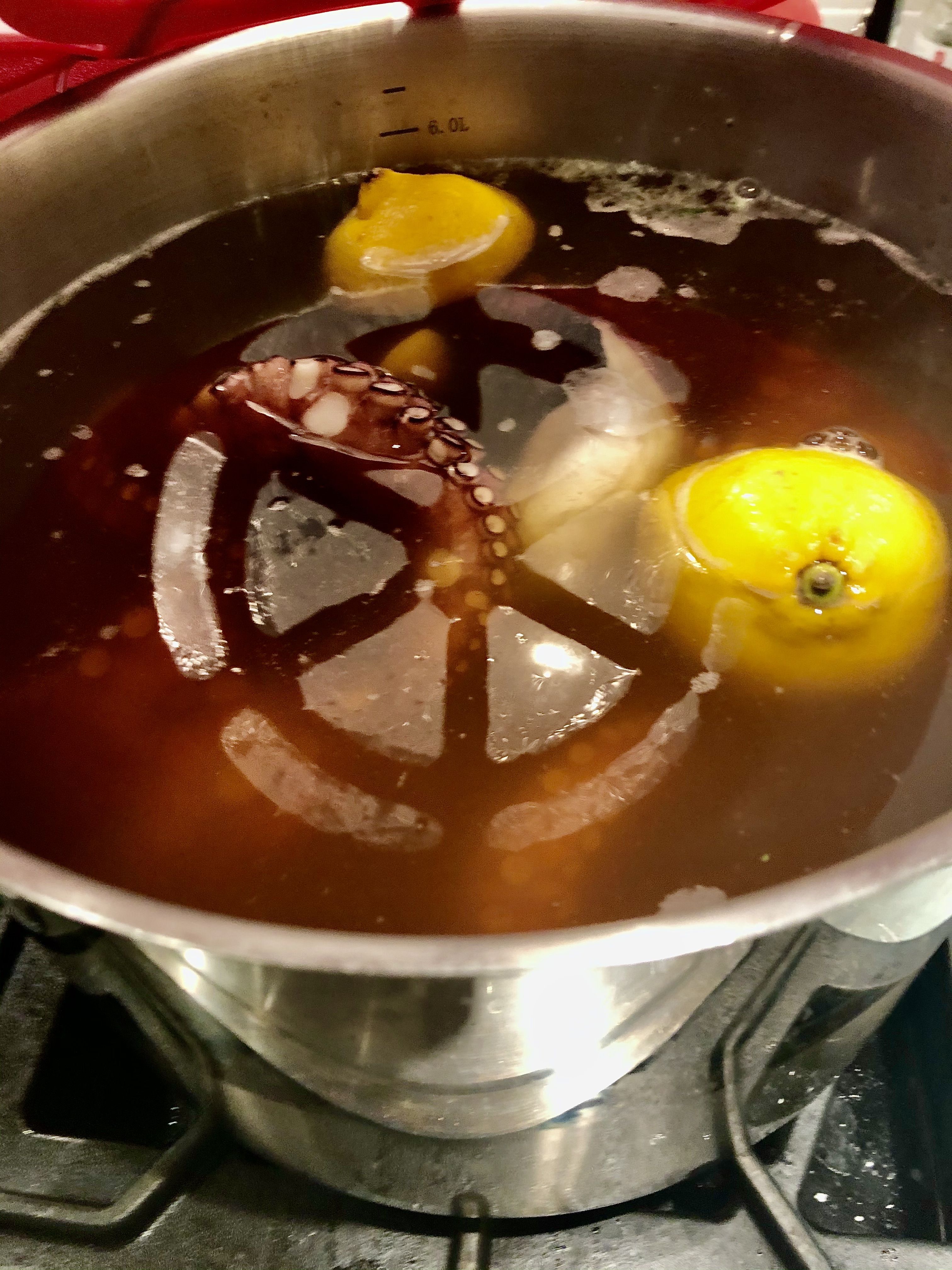 - Dip the octopus into the pot three times to help curl up the tentacles. Then, submerge and cook on medium-high heat for 40-60 minutes until the octopus has little resistance when inserting a fork or knife into the tentacles. Remove and let rest for 30 minutes.