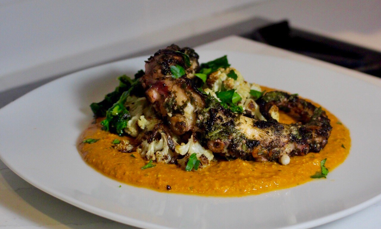 - Heat in a pan or a pot and serve a generous portion on the base of the grilled octopus.